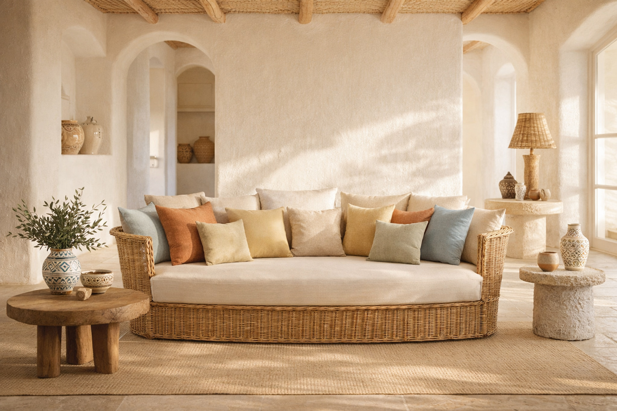 Cushions in polyurethane foam, removable and covered with an ecru base-category fabric or with a higher category whose colors and patterns are selectable under "fabrics". We can make this item to measure and with different kinds of material too.