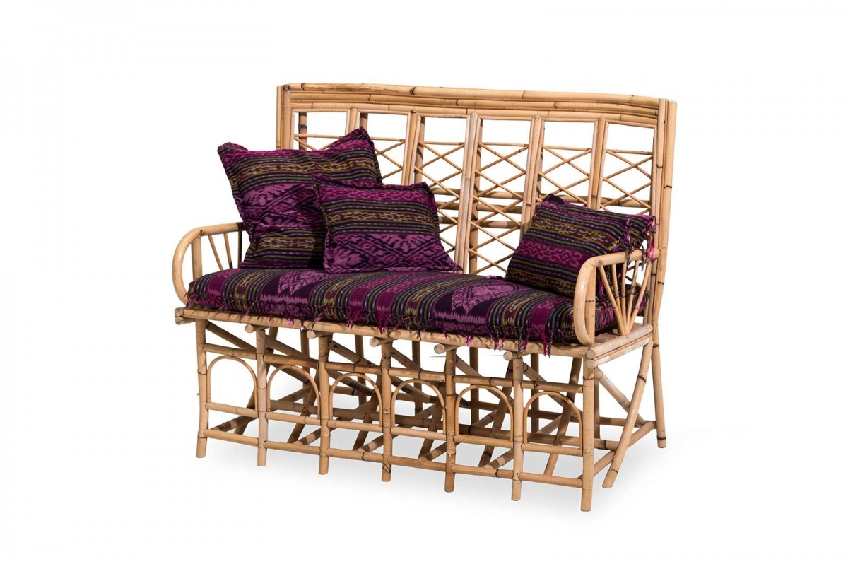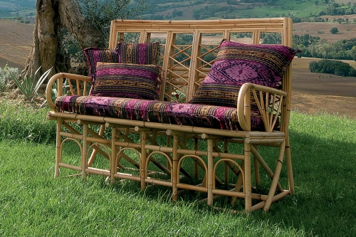 The AFRIKA 2 seater bench have a natural manao handmade frame, and transparent finishing,.Cushions in polyurethane foam, removable and covered with an ecru base-category fabric or with a higher category whose colors and patterns are selectable under "fabrics"