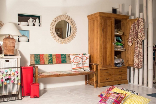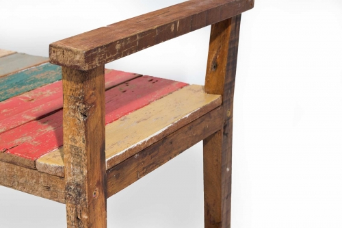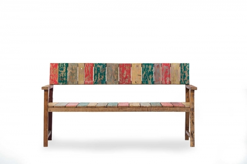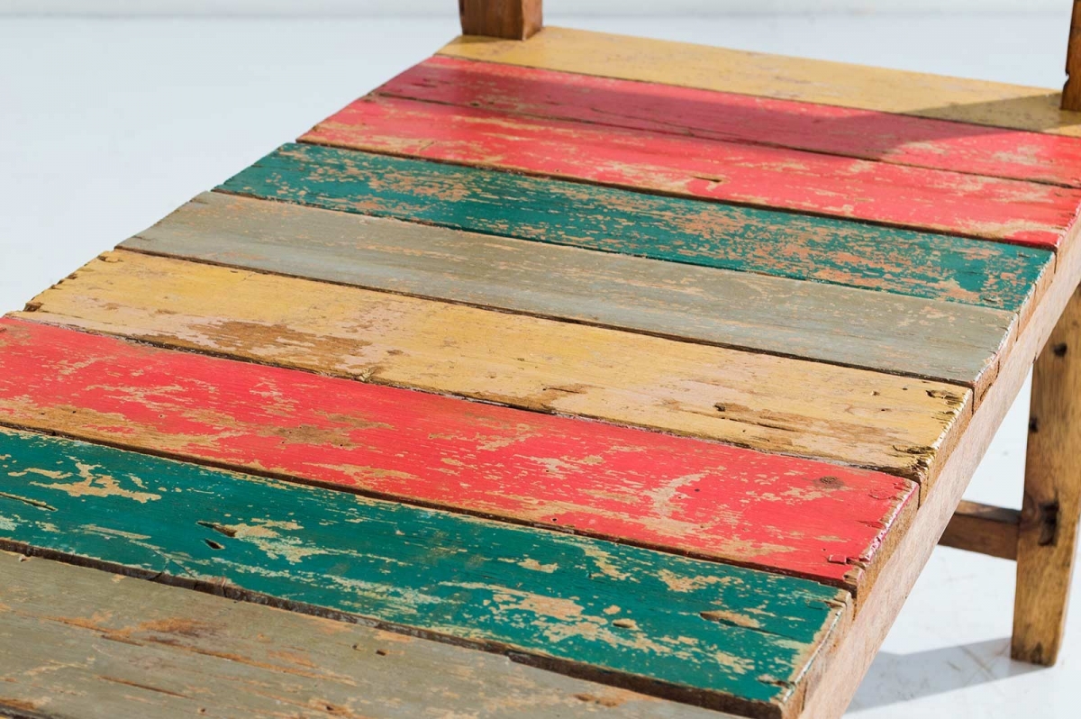 Massive Teakbank aus recycelten farbigen Brettern, einfach und fröhlich. Die Wohnzimmer- oder Außenbank bringt Farbe in Ihr Zuhause.