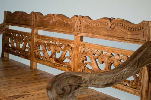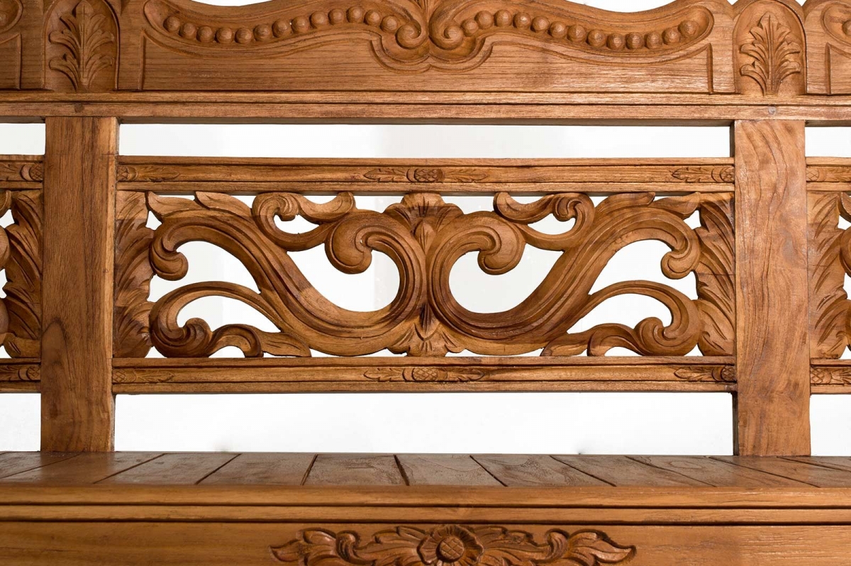 Bank aus massivem Teakholz, von erfahrenen Graveuren von Hand gefertigt und graviert. Die Linie und die Verzierungen weisen auf ihren fernen Ursprung hin: die Insel Java. Die Bank Flora verschönert mit ihrem Konzentrat handwerklicher Verarbeitung in Kombination mit dem warmen Holzton Ihr Zuhause in jeder Umgebung.