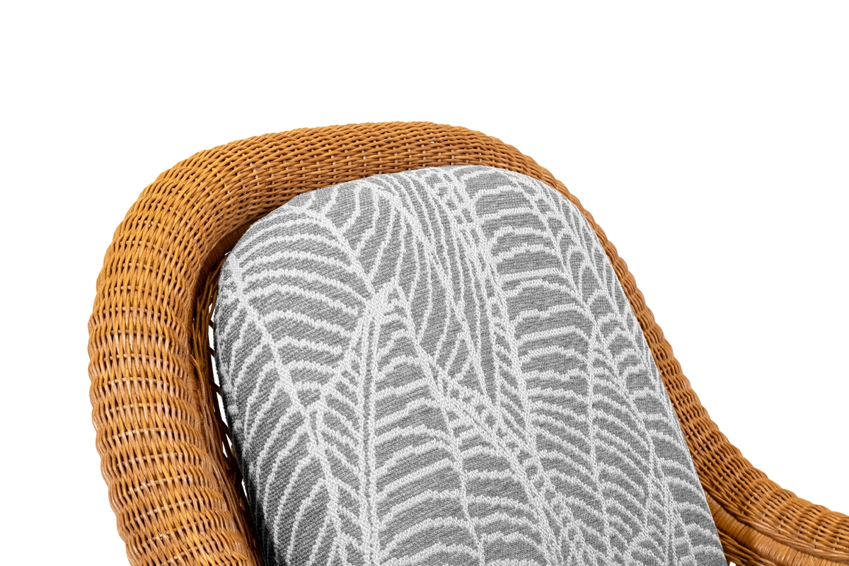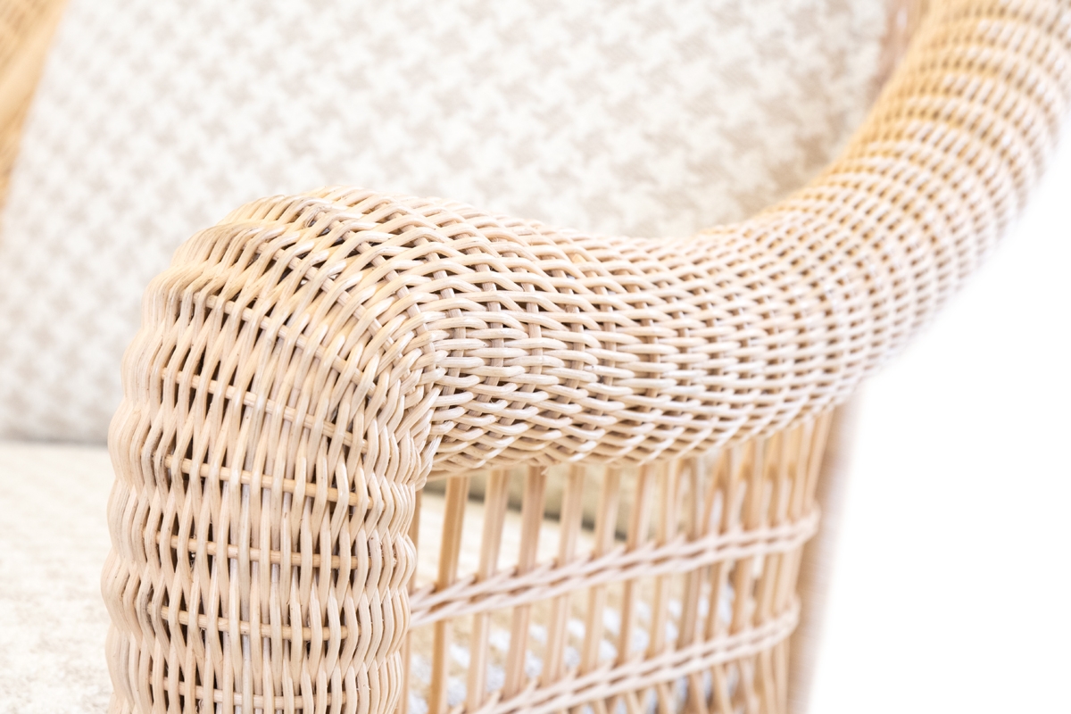 Rattan frame, woven with wicker by 3mm. Transparent finish. Cushions in polyurethane foam, removable and covered with an ecru base-category fabric or with a higher category whose colors and patterns are selectable under "fabrics".