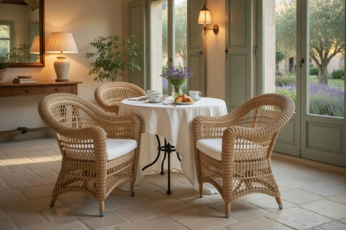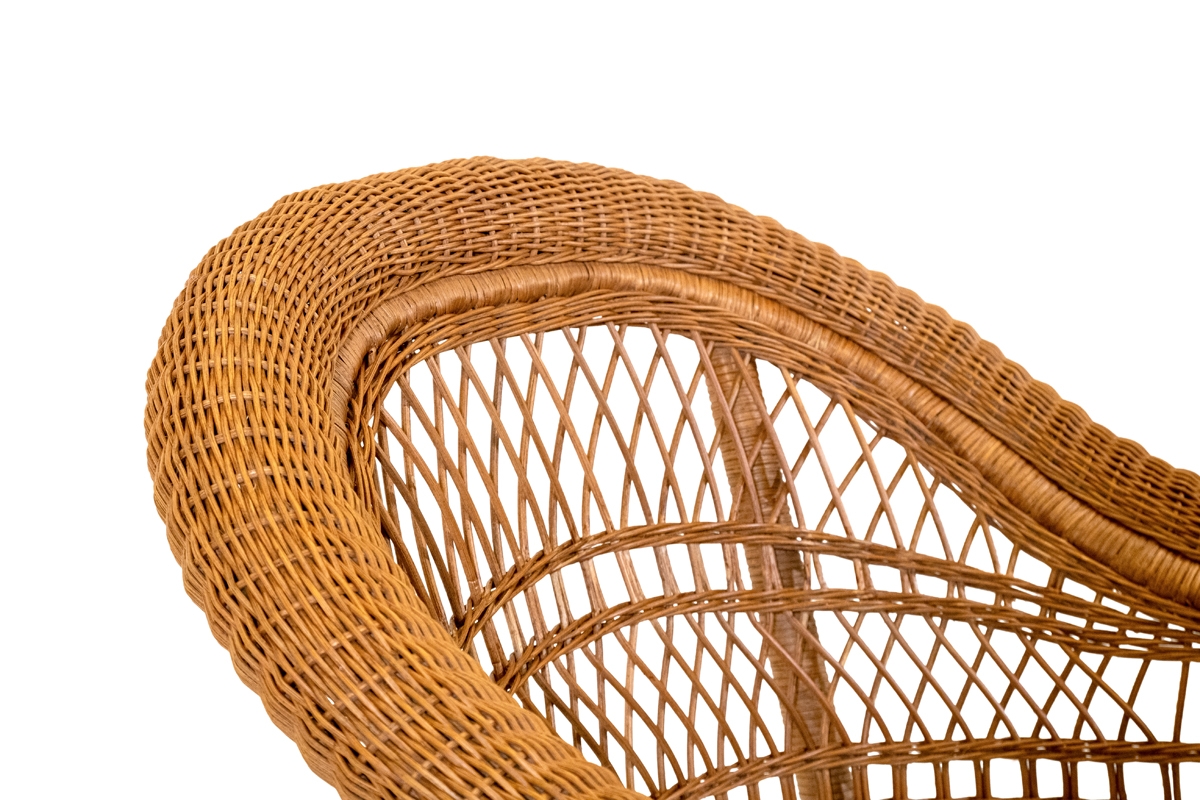 Rattan frame, woven with wicker by 3mm. Transparent finish. Cushions in polyurethane foam, removable and covered with an ecru base-category fabric or with a higher category whose colors and patterns are selectable under "fabrics".
