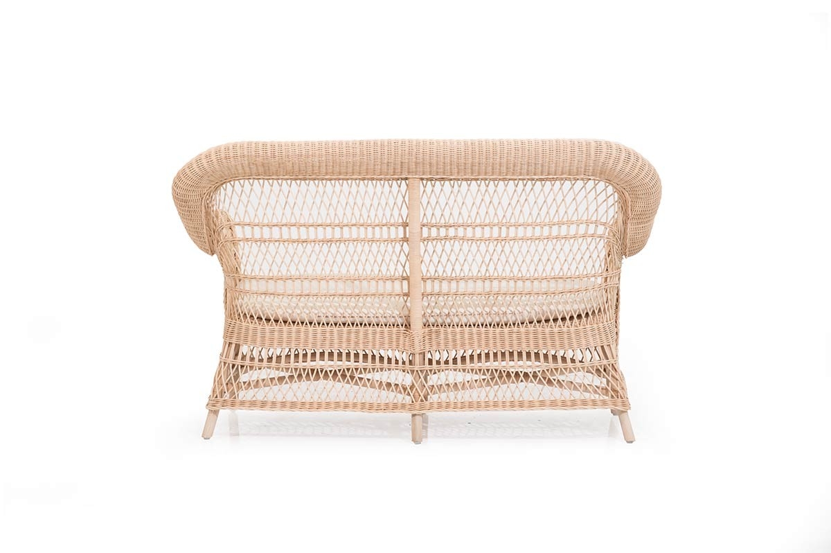 Rattan frame, woven with wicker by 3mm. Transparent acrylic finish..Cushions in polyurethane foam, removable and covered with an ecru base-category fabric or with a higher category whose colors and patterns are selectable under "fabrics".