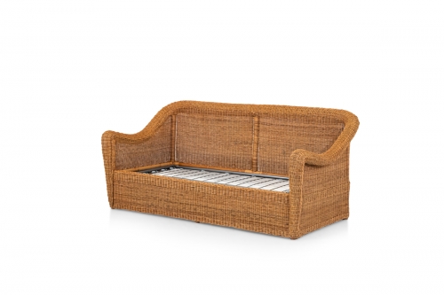 Schlafsofa aus natürlichem Rattan-Geflecht mit matt-transparenter Oberfläche.