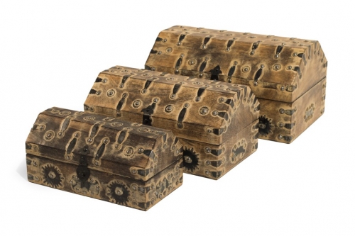 Wooden caskets embellished with engravings and metal details: a way to decorate and keep your home in order.