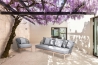 Sie verfügt über ein Gestell aus natürlichem Teakholz und ist mit abnehmbaren und waschbaren Kissen bezogen.