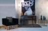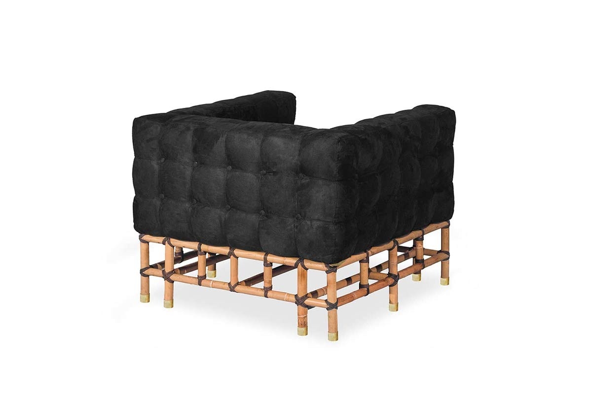 Gepolsterter Sessel aus schwarzem Wildleder, mit natürlichem Manao-Fuß.