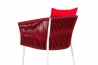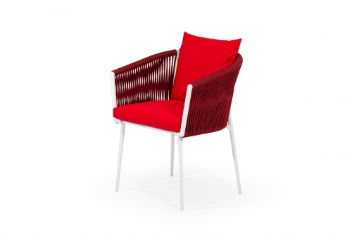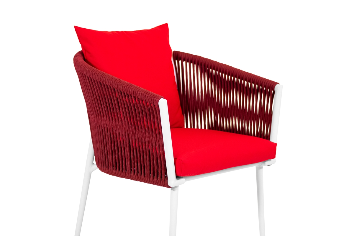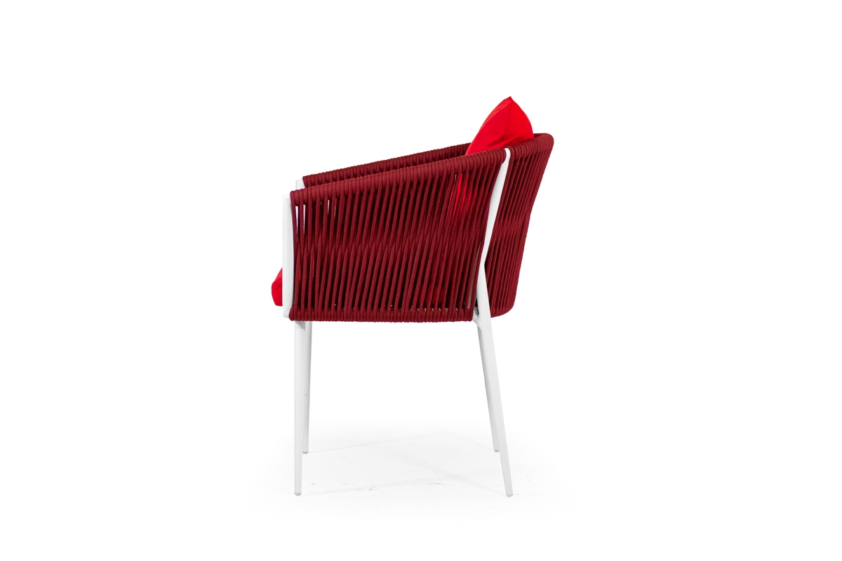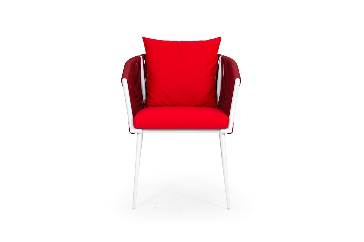 Die Kollektion Isotta zeichnet sich durch ihr dichtes und präzises Flechtwerk aus, das von erfahrenen Handwerksmeistern in Handarbeit gefertigt wird. Dieses umhüllt ein robustes, weiß lackiertes Aluminiumgestell, das an Armlehne und Rückenlehne sichtbar ist. Der Kontrast zwischen der Farbintensität der Kissen und der Eleganz der Materialien macht jedes Stück einzigartig und wiedererkennbar.