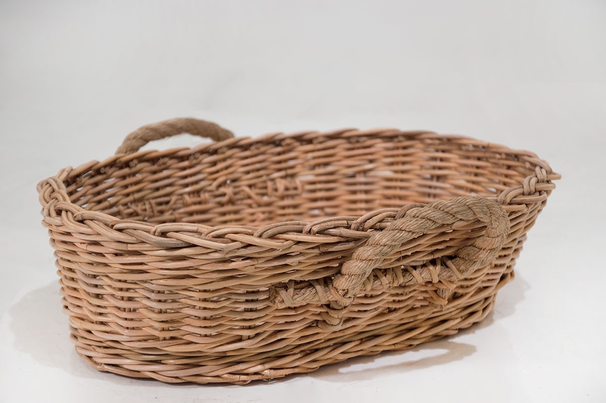 Korb aus dunklem Pulut, eingefasst mit einem Zopf und Kordelgriffen. Komplett handgefertigt.