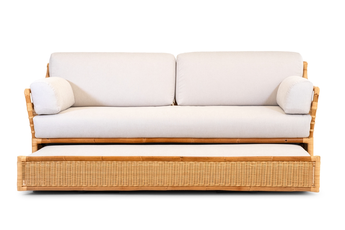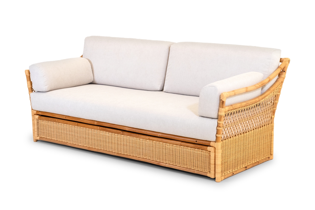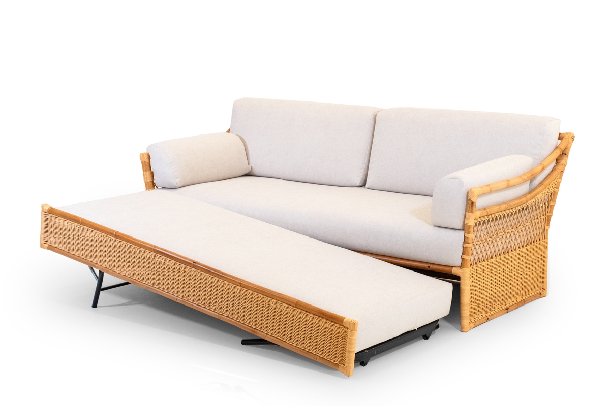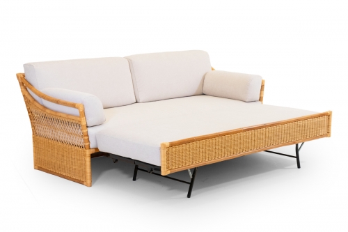 Geflochtenes Schlafsofa aus natürlichem Rattan mit matter transparenter Oberfläche.