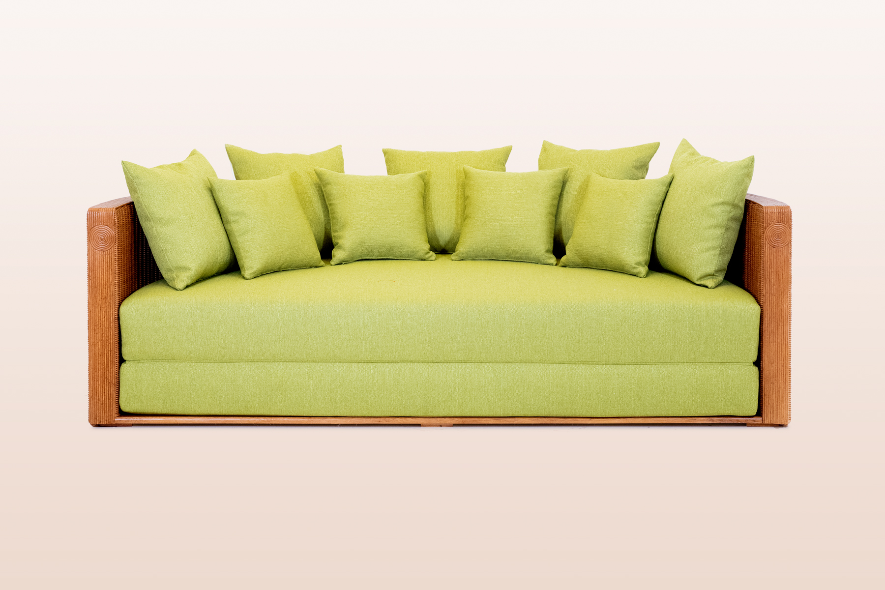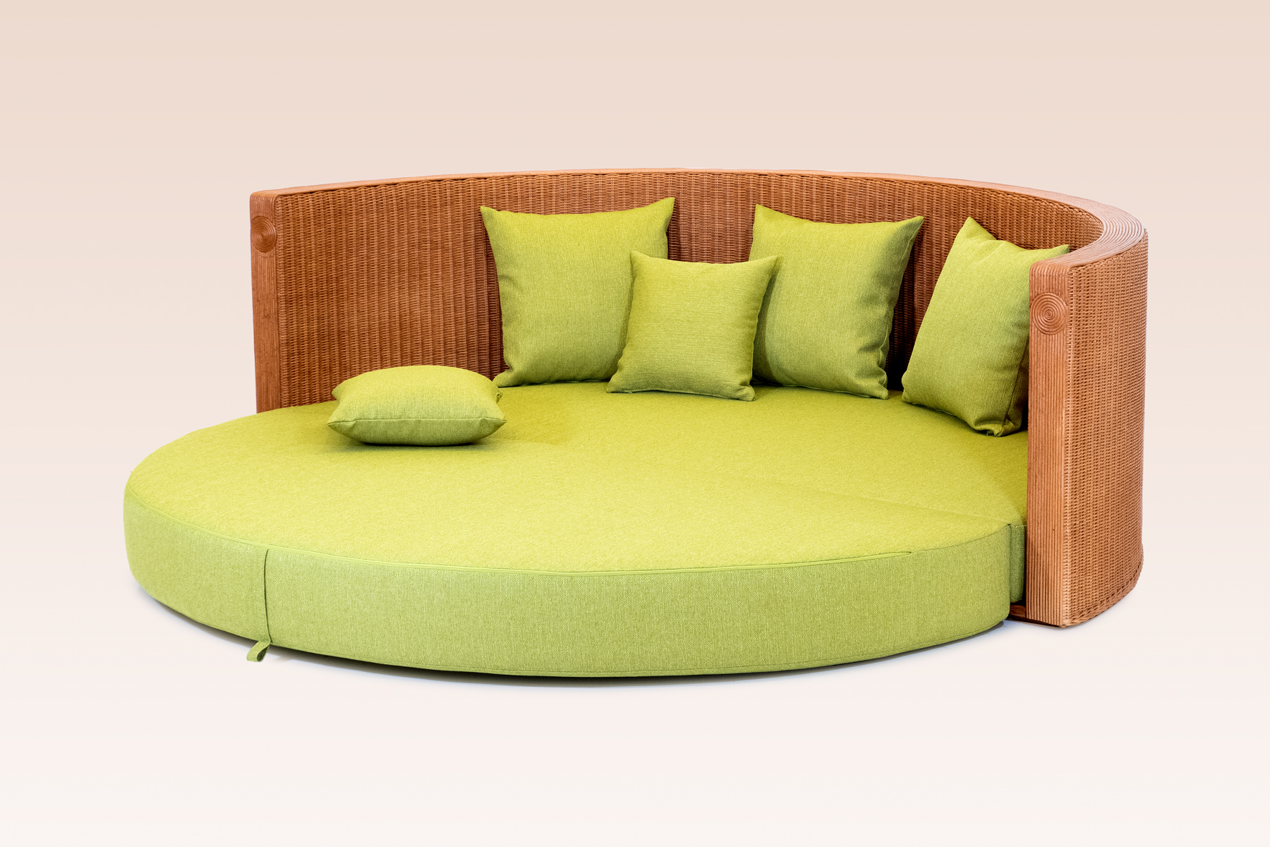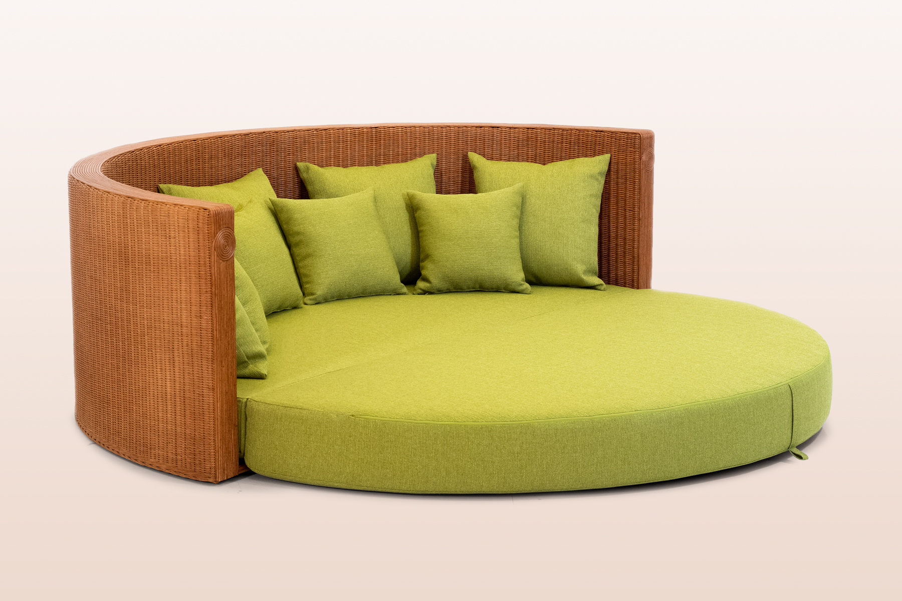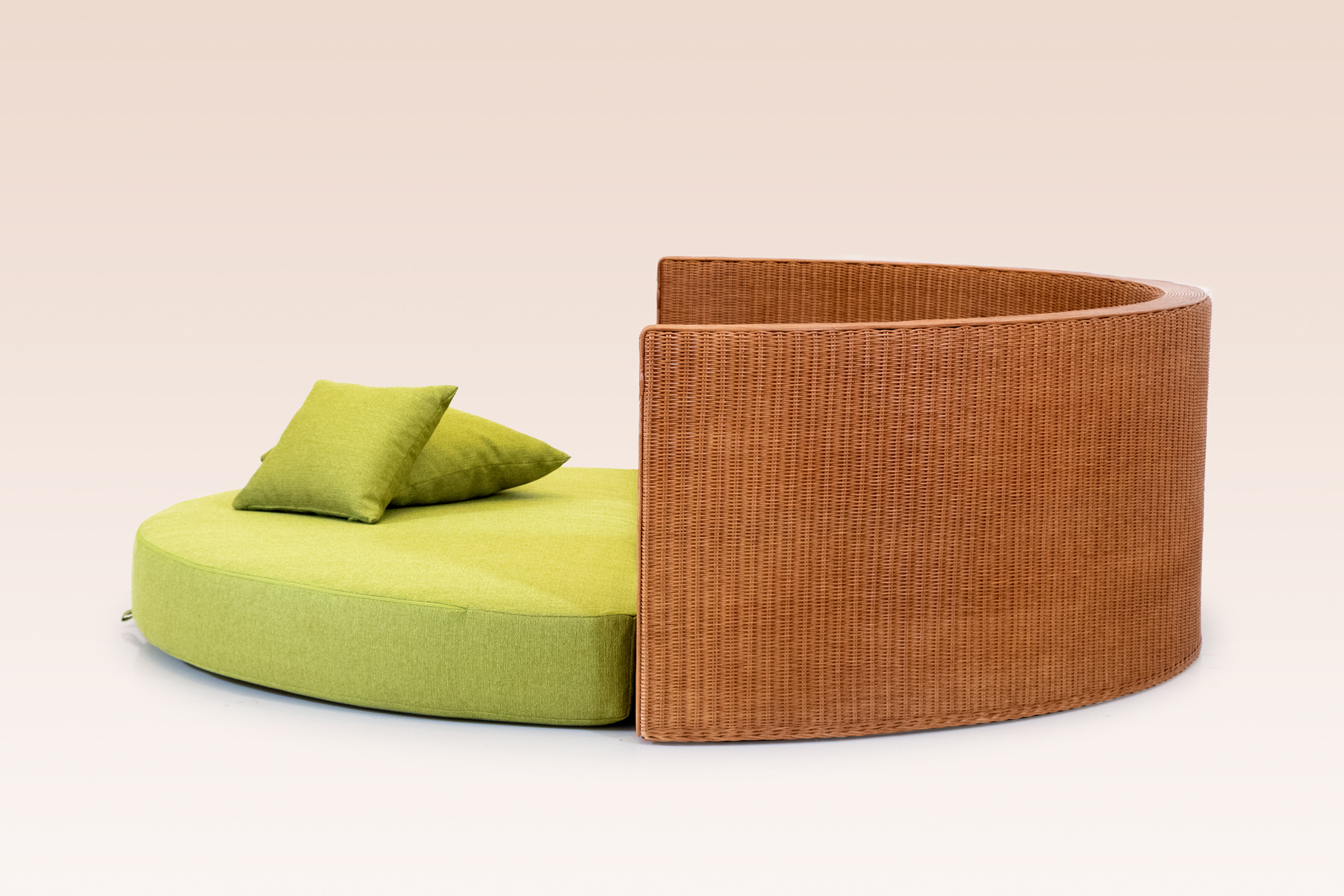 The frame consists of a wooden structure that supports two large woven surfaces, in & outsied, which develop without interruption in the rattan weave. It can be dyed and customized with various types of colouring. The continuous weaving, without interruptions and applied on such an extensive and clean surface, enhances the very essence of the workmanship which is shown in its most essential and pure form.
