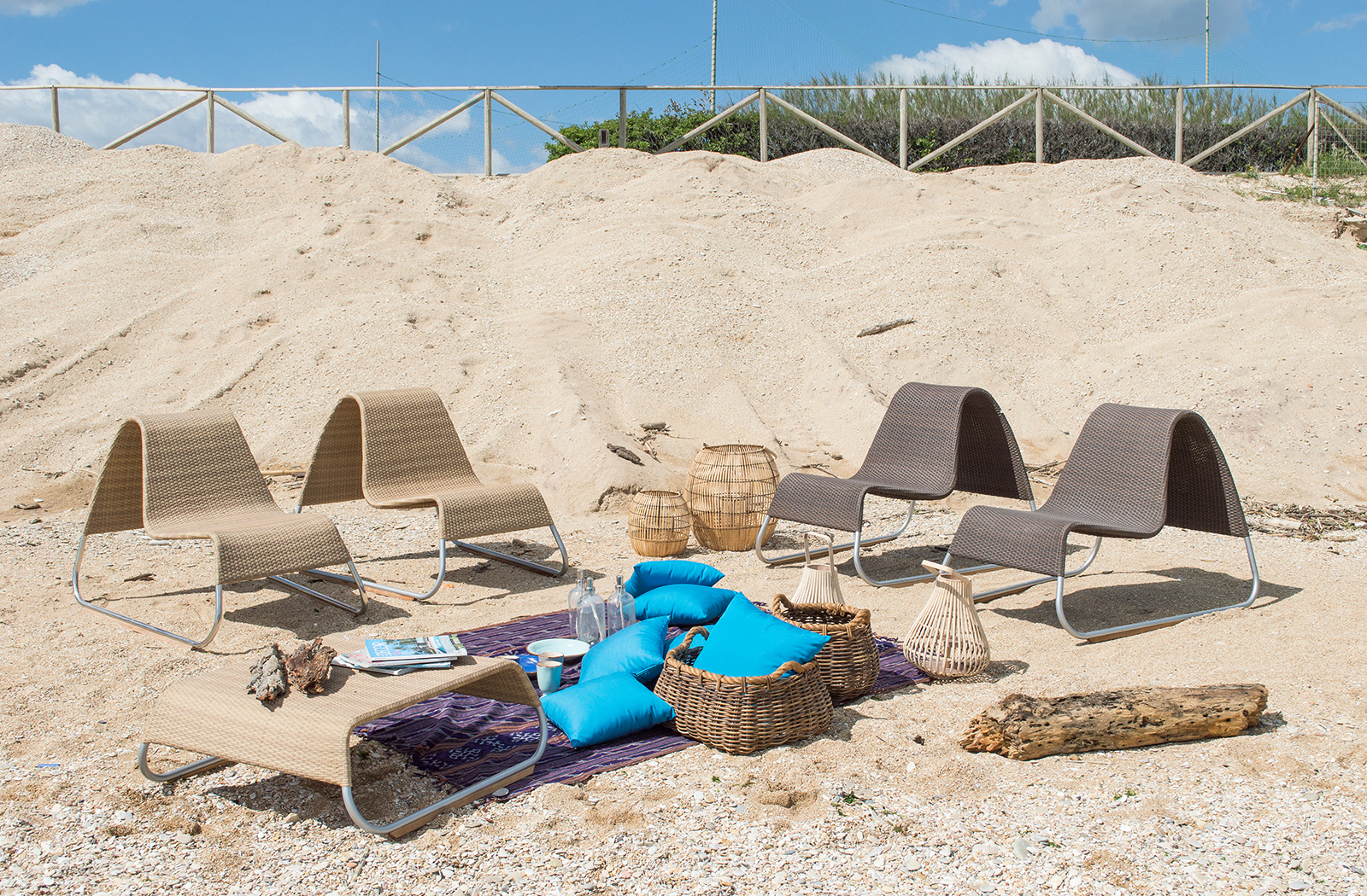 The pieces that make up the Plan collection are entirely hand-woven by expert Master Craftsmen, with a particular synthetic fiber designed and built to withstand various atmospheric agents. This fiber is also highly resistant to abrasion, heat and UV rays. The frames are made of aluminum in order to avoid rust and to make even the largest sofas light.