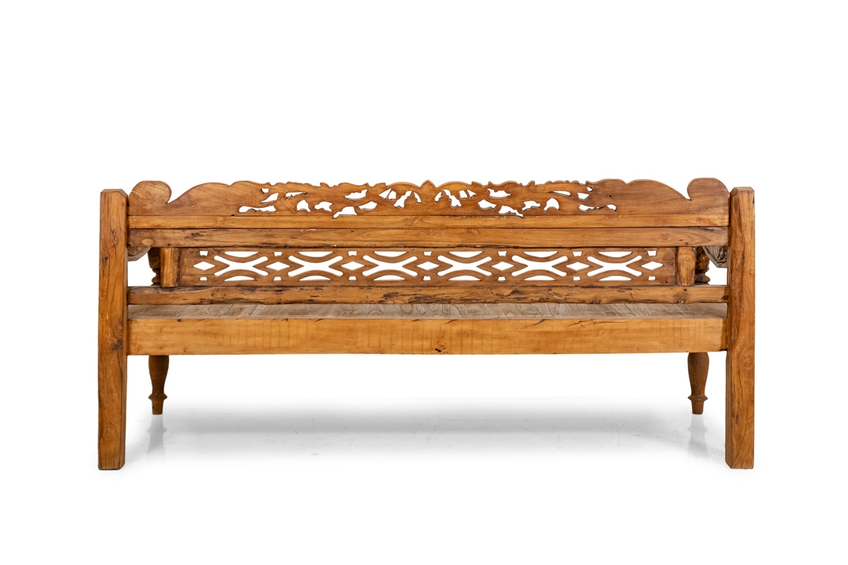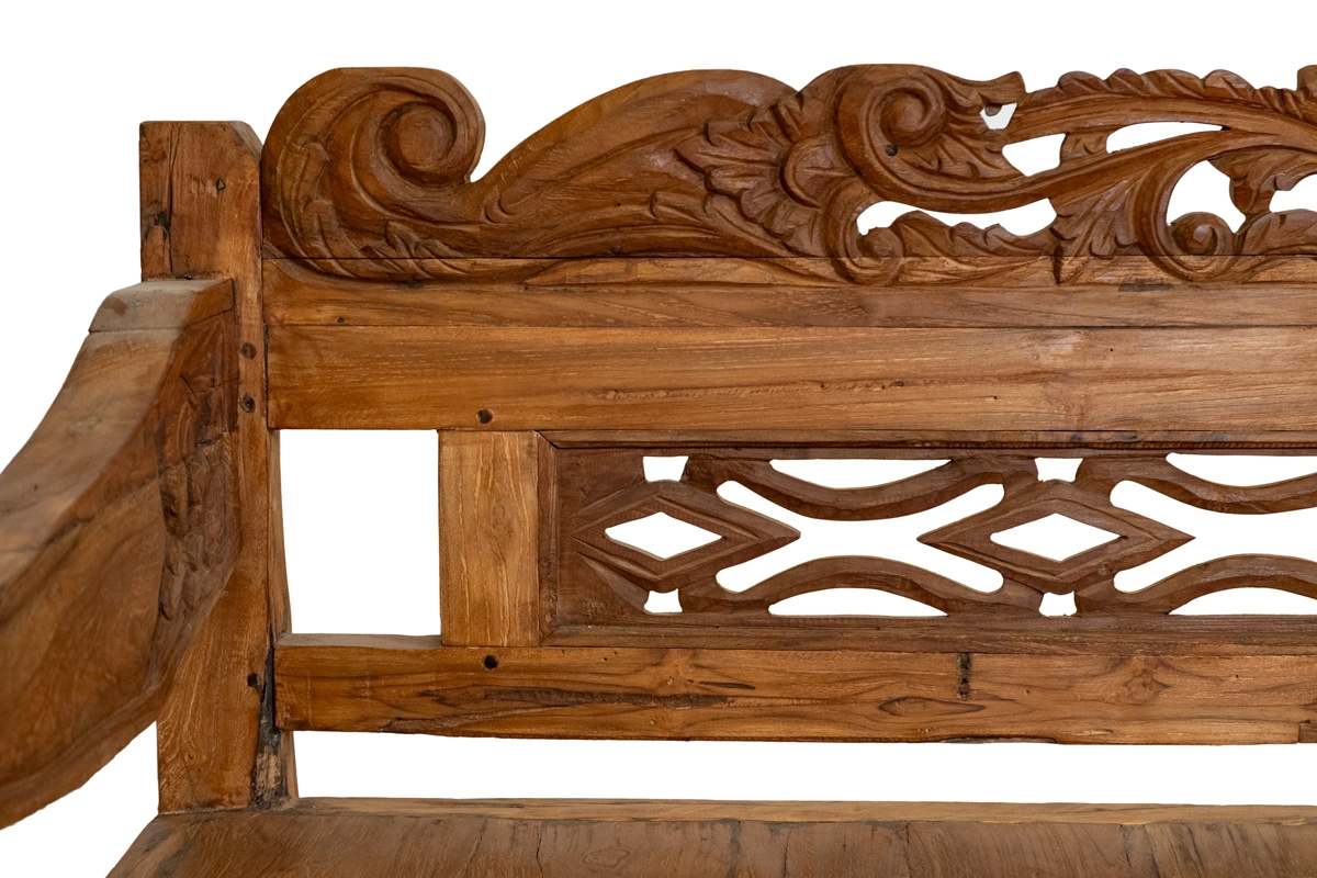 BENCHES SHOP 890 - teak bench L0890 Bench in solid teak made and engraved by hand by skilled engravers. The line and the decorations denote its distant origin: the island of Java. The Flora bench, with its concentrate of skilled workmanship combined with the warm tone of wood, will embellish your home in any environment.Natural color Add to cart