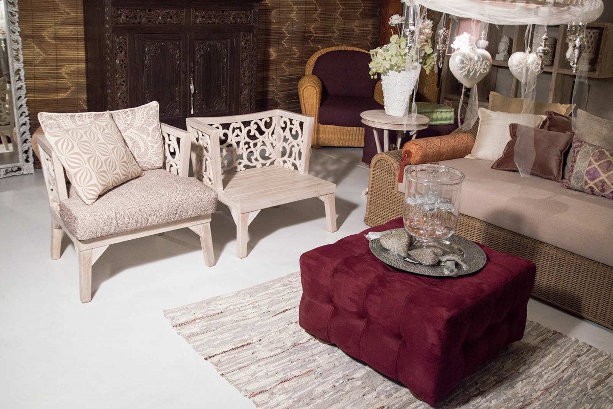 Chairs & Benches SHOP 354 - teak bench L0354 Handmade teak bench with engravings.Floral fabric. Cushions: 4(50x50) + 5(40x40) + 1back.Colour: black Add to cart