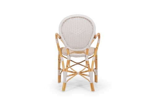 Inspired by the classic Parisian cafés, this Bistrot chair is the perfect blend of style and functionality. The sophisticated yet rugged look is given by its sturdy aluminum frame, the synthetic rattan weave and the natural cane effect finish, with its typical bark and knots. Thanks to its exceptional comfort and long-lasting durability, it is the ideal chair for furnishing hospitality facilities.