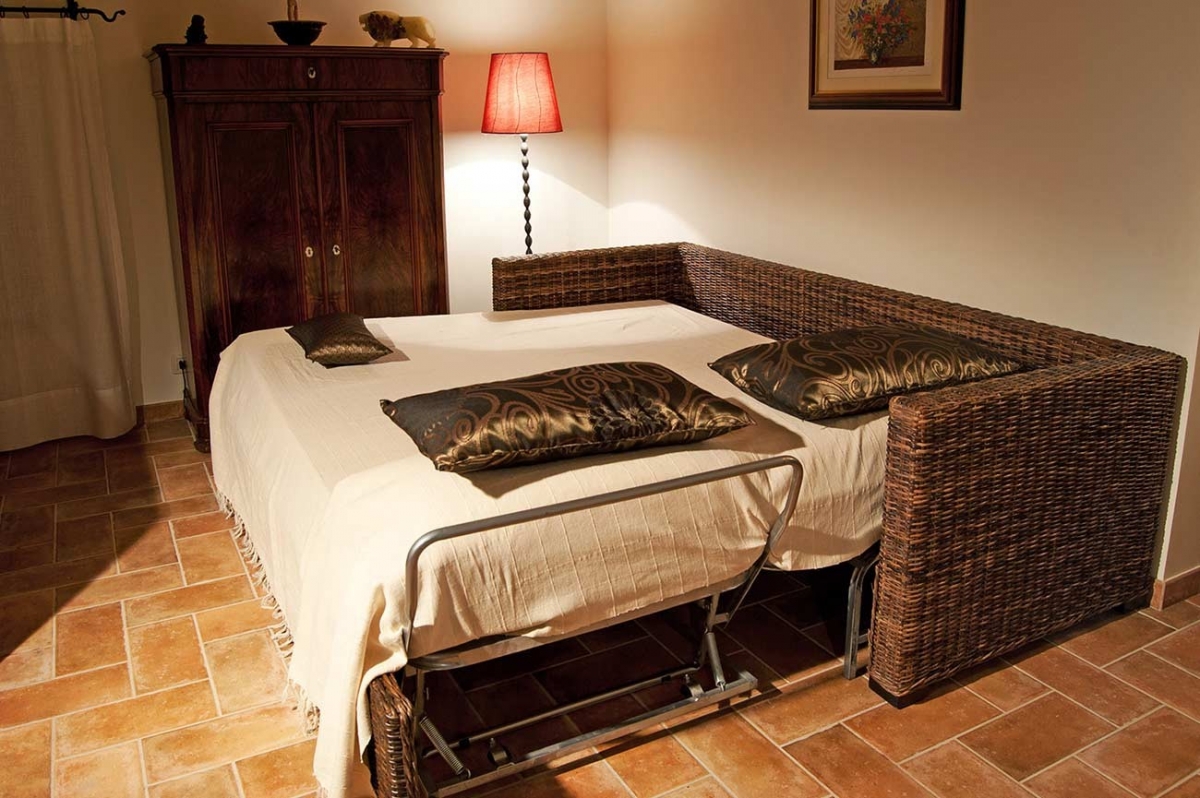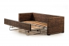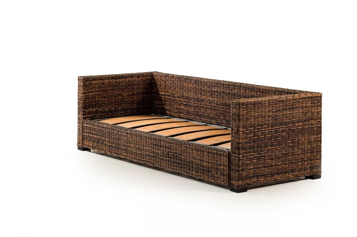 Sofa bed with wooden frame and natural rattan weaving. Matte transparent finish.