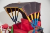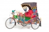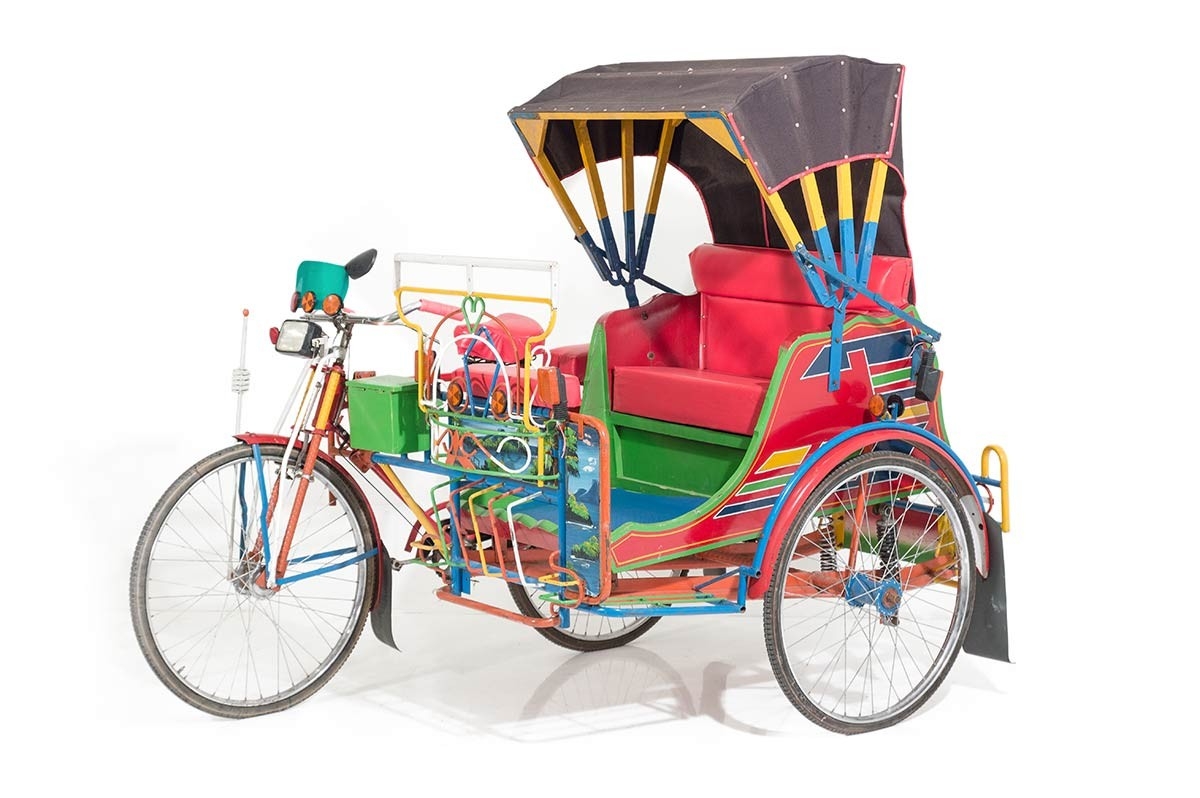 Indonesian rickshaw with folding canopy, driver and passenger seat.