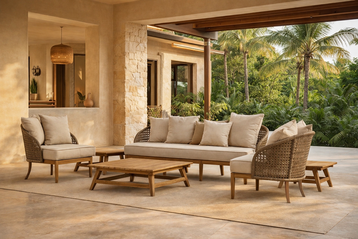 It has a base in natural teak and is upholstered with removable and washable cushions.