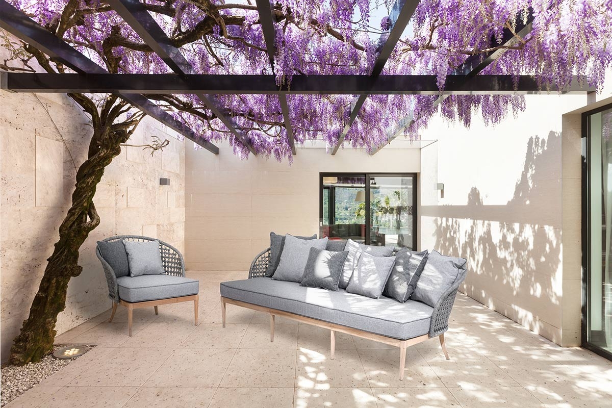 It has a base in natural teak and is upholstered with removable and washable cushions.