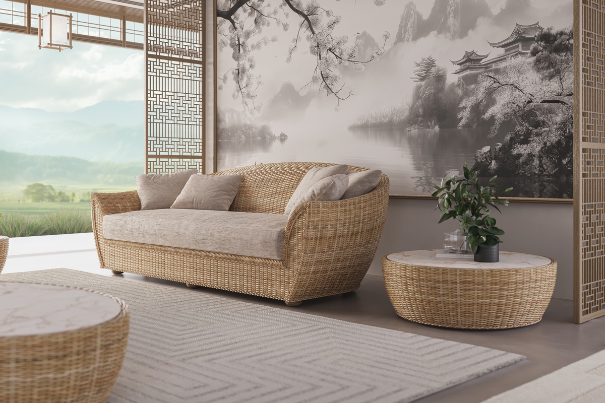 The pieces that make up the Retrò collection have a wooden frame covered in 6mm half moon natural rattan core entirely hand-woven by expert Master Craftsmen. Transparent matte finish.
