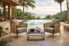 The Isotta collection stands out for its dense, precise weave, handcrafted by skilled artisans, which envelops a sturdy white-painted aluminium frame, visible in the details of the armrest and backrest. The contrast between the vibrant cushions and the elegance of the materials makes each piece unique and distinctive.