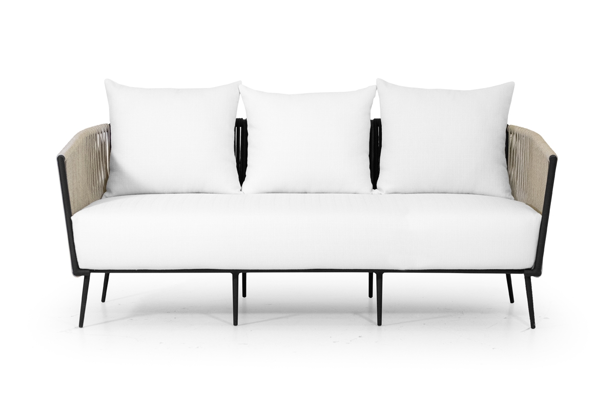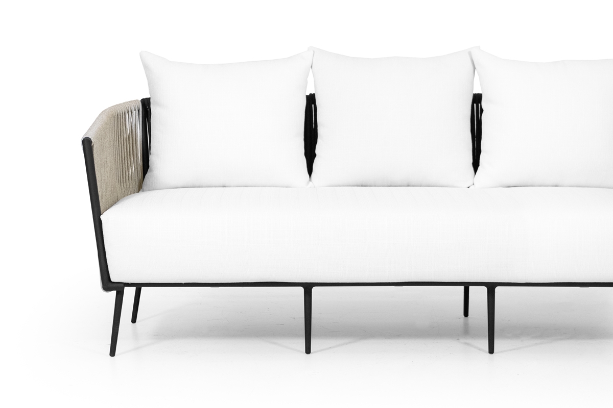 The Isotta collection stands out for its dense, precise weave, handcrafted by skilled artisans, which envelops a sturdy white-painted aluminium frame, visible in the details of the armrest and backrest. The contrast between the vibrant cushions and the elegance of the materials makes each piece unique and distinctive.