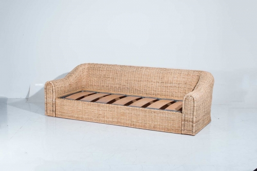 Sofa bed with wooden frame and natural rattan weaving. Matte transparent finish.