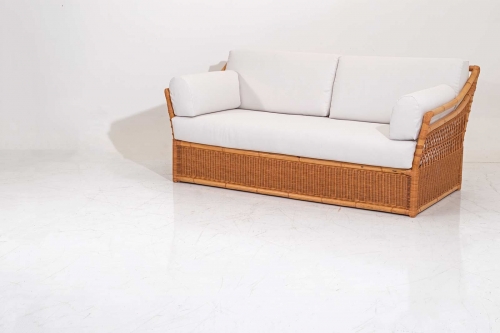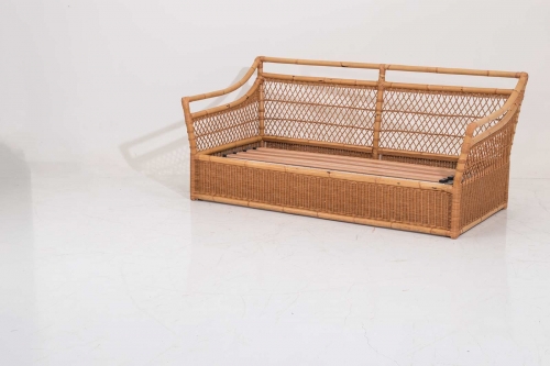 Sofa bed woven in natural rattan with matte transparent finish.