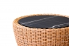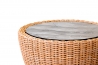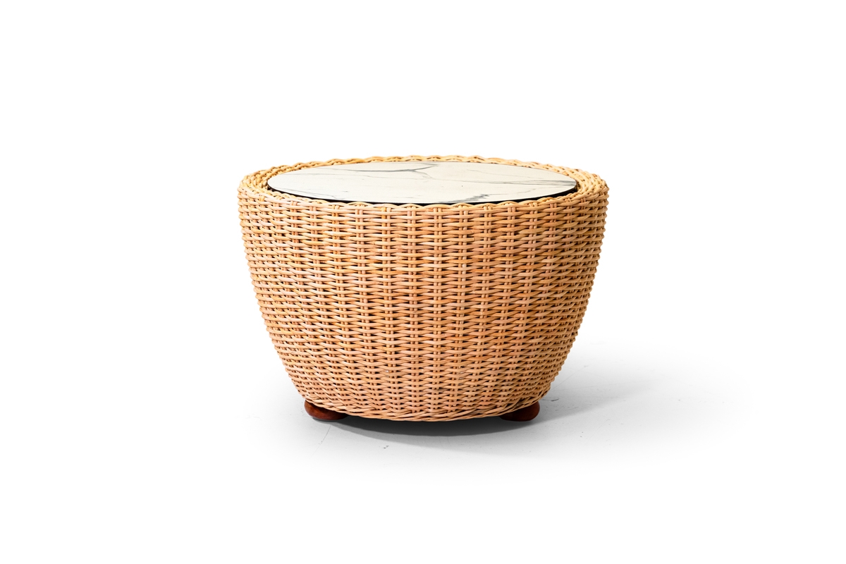 I pezzi che compongono la collezione Retrò hanno un telaio in legno rivestito in rattan naturale interamente intrecciato a mano da esperti Maestri Artigiani, top in HPL o in vetro, su richiesta.