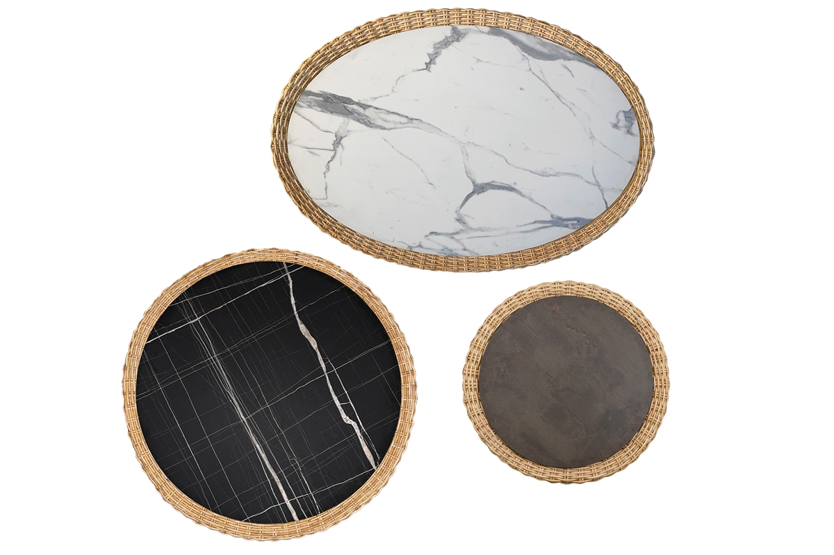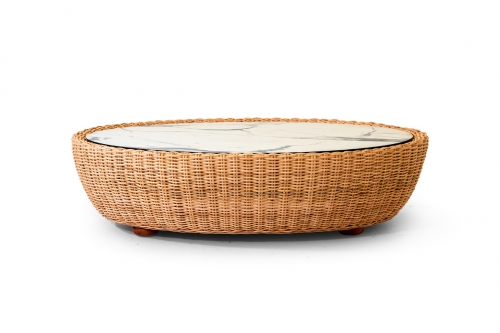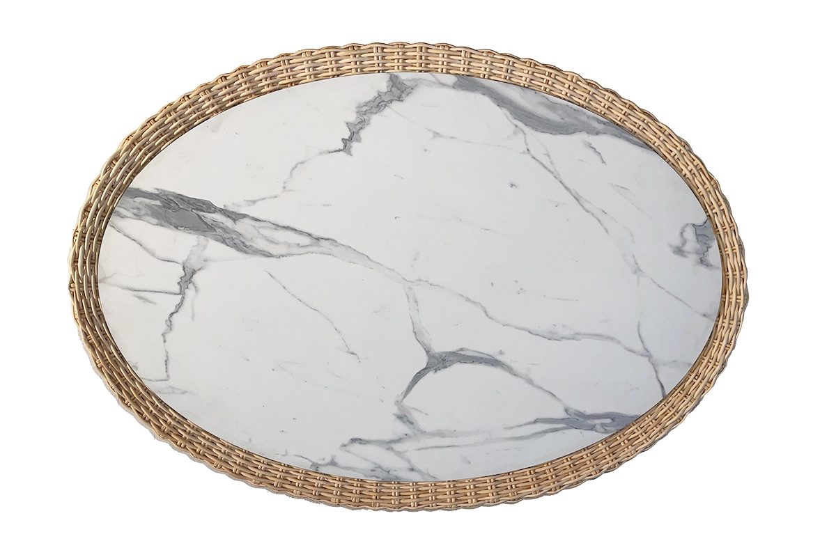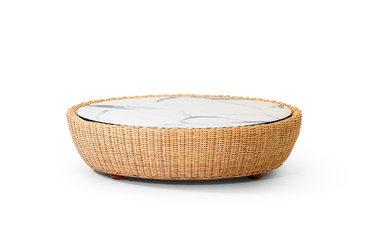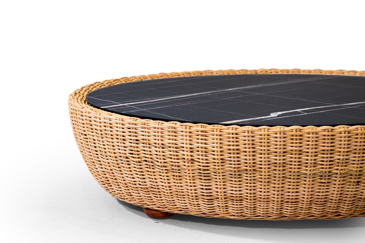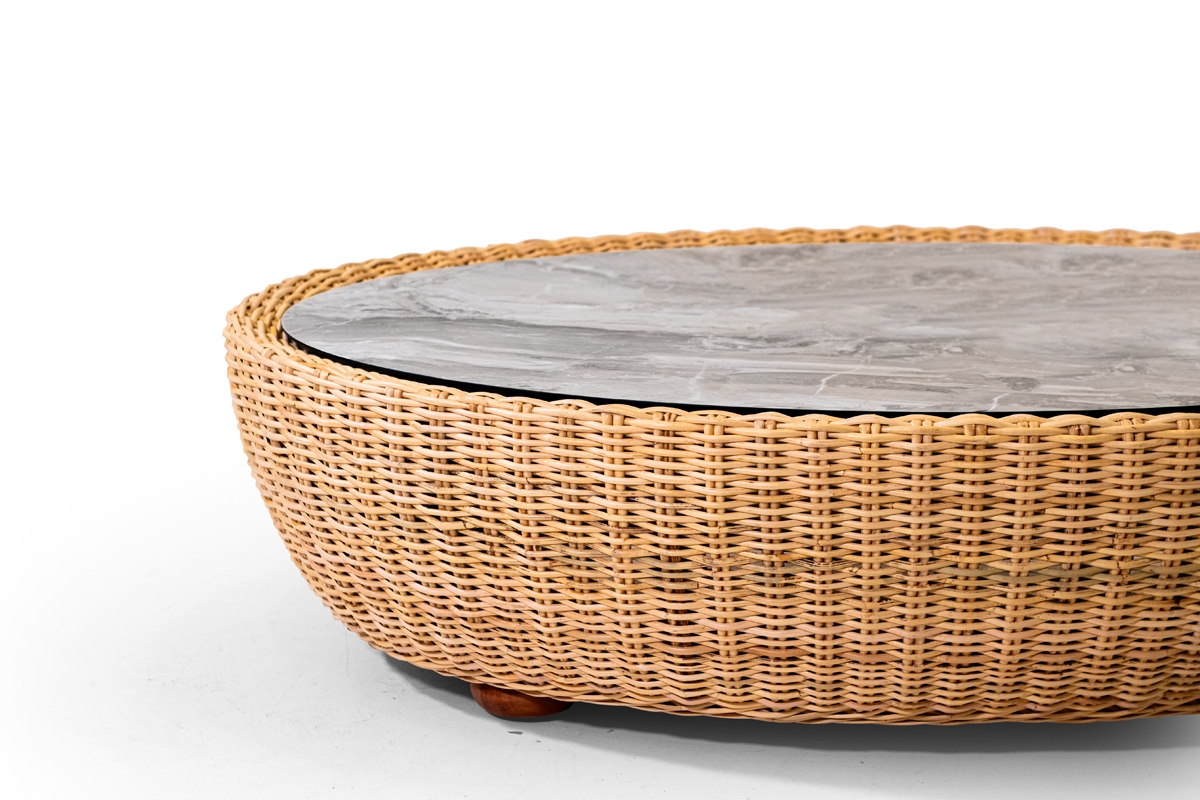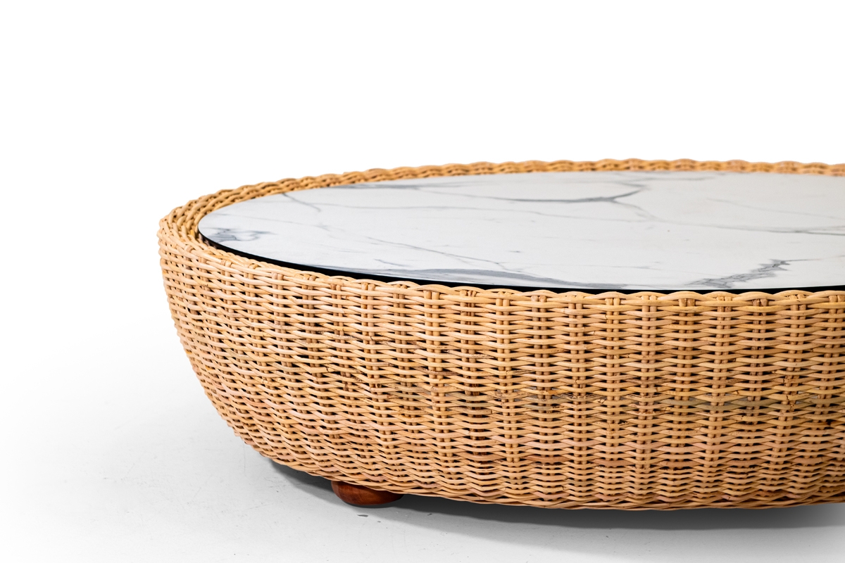 I pezzi che compongono la collezione Retrò hanno un telaio in legno rivestito in rattan naturale interamente intrecciato a mano da esperti Maestri Artigiani, top in HPL o in vetro, su richiesta.