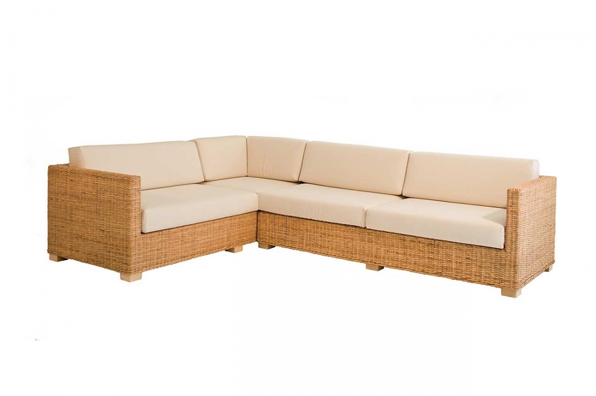Divano ad angolo in Rattan con telaio in legno, intrecciato in croco o giunco naturale da 6mm. Finitura trasparente opaca.