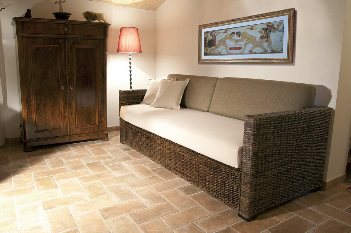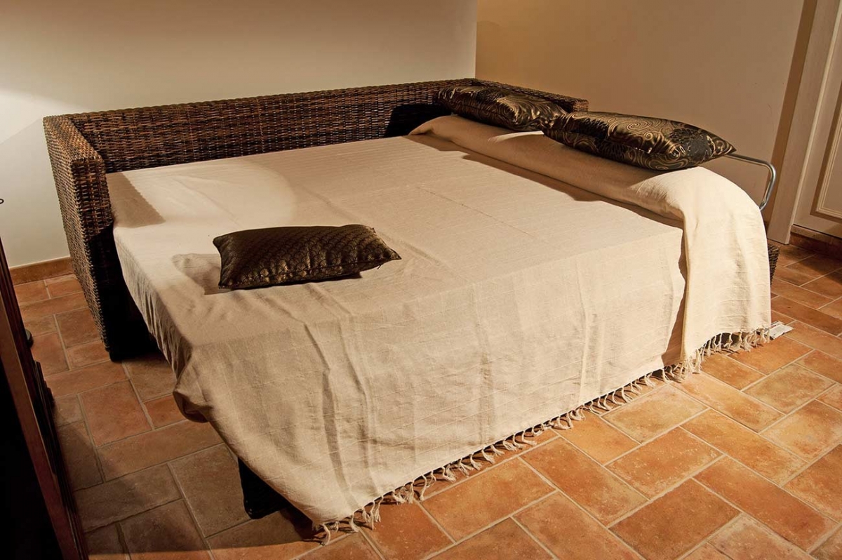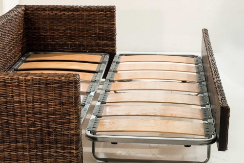 Divano letto con telaio in legno ed intreccio in rattan naturale. Finitura trasparente opaca