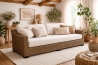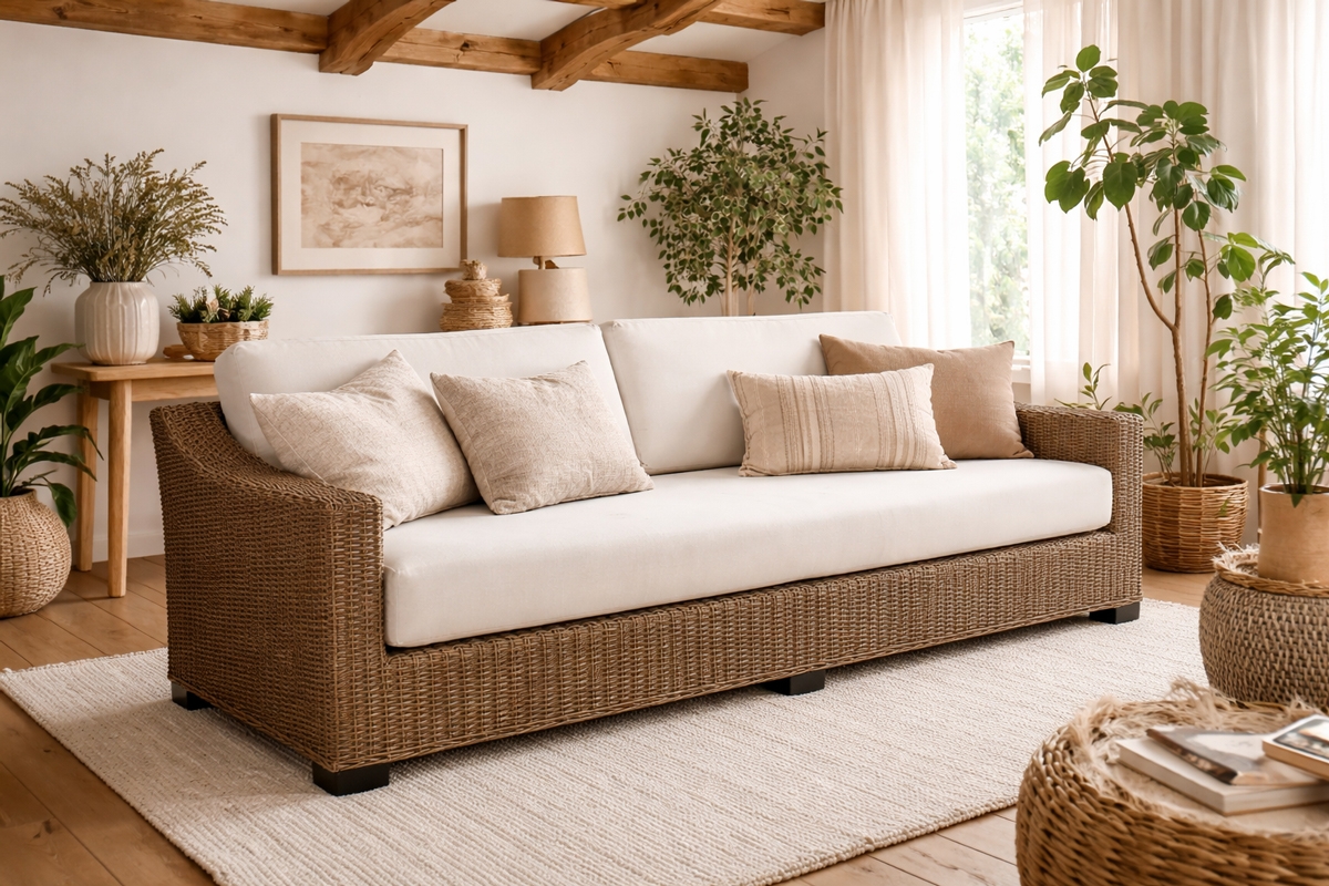 Divano 3 posti con telaio in legno, intrecciato in croco o giunco naturale da 6mm. Finitura trasparente opaca.