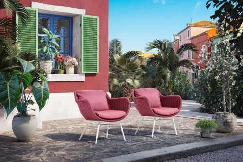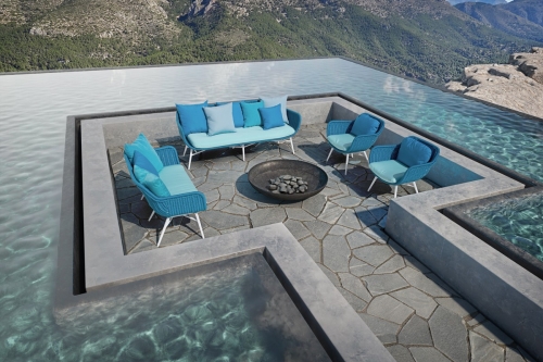 la linea CÒCO ha un telaio in alluminio verniciato a polvere ed un intreccio in corda di polipropilene interamente fatto a mano. Tappezzeria in poliuretano espanso, rivestito con tessuto idrorepellente, sfoderabile e lavabile.