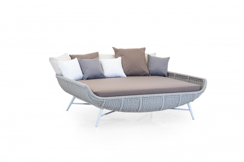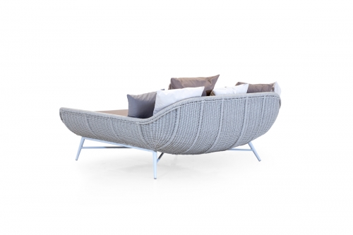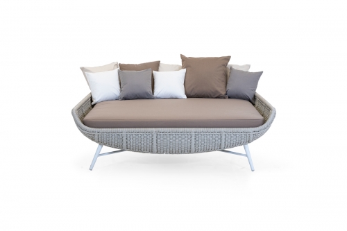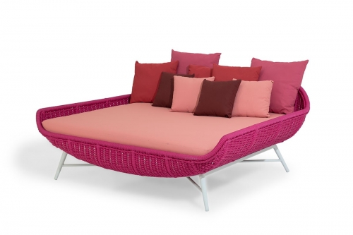 la linea CÒCO ha un telaio in alluminio verniciato a polvere ed un intreccio in corda di polipropilene interamente fatto a mano. Tappezzeria in poliuretano espanso, rivestito con tessuto idrorepellente, sfoderabile e lavabile.