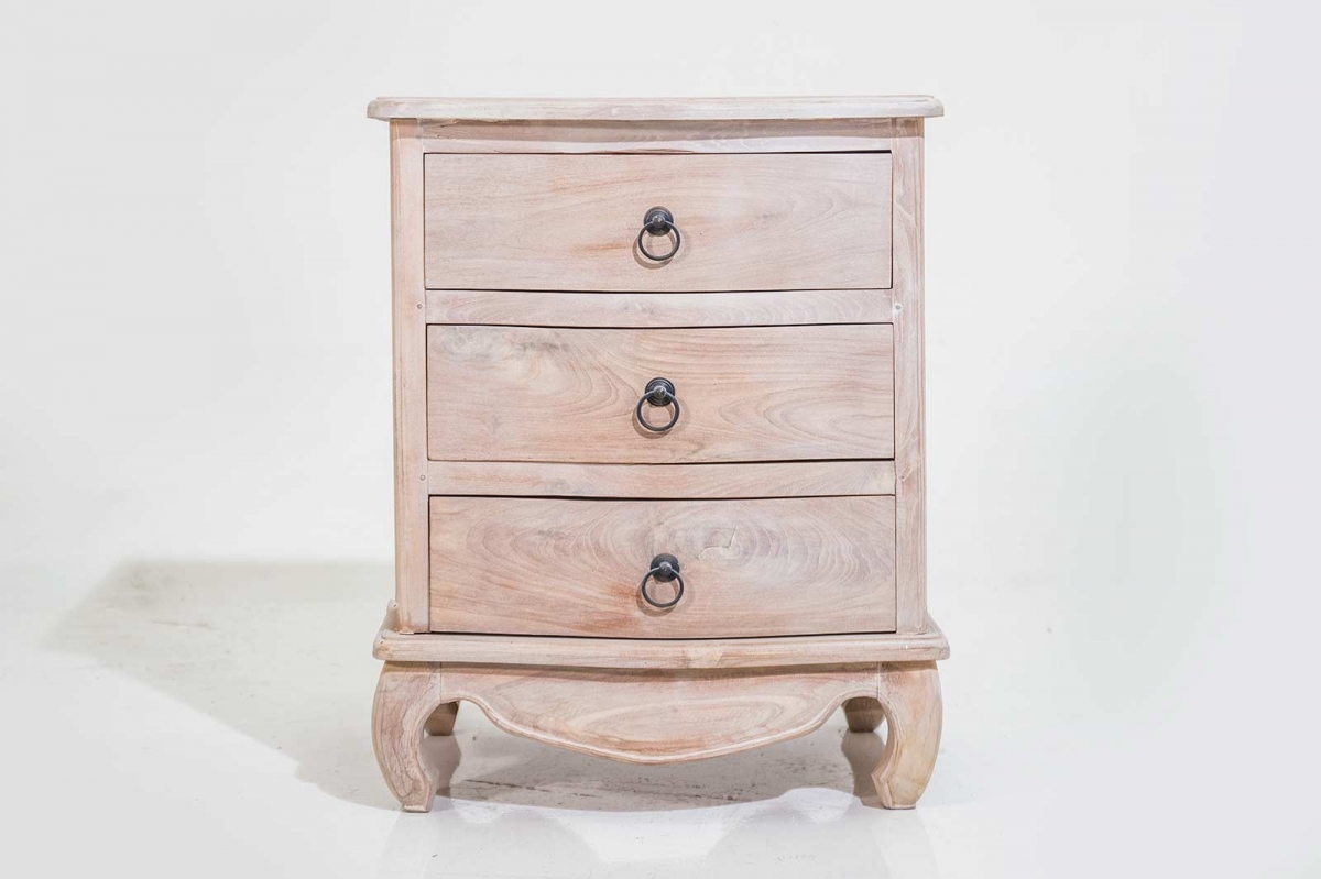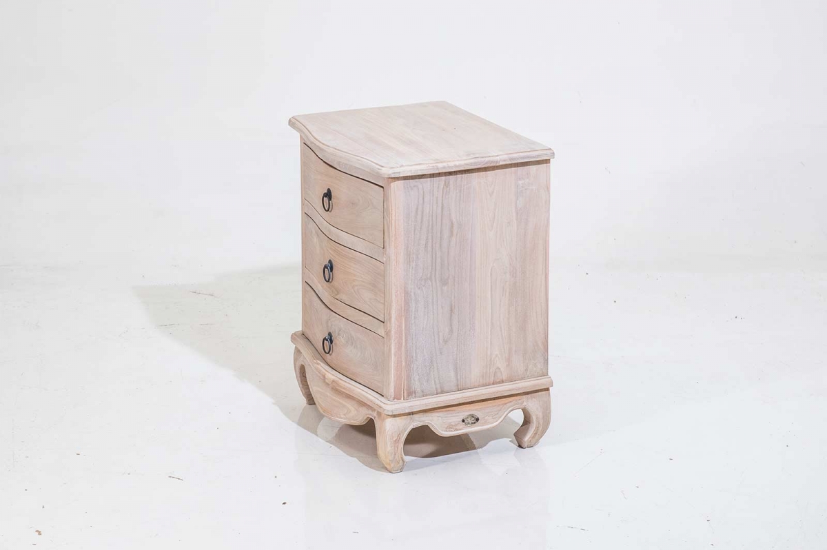 COMODINI SHOP 639 - comodino L0639 Comodino dalle linee eleganti, in teak intagliato a mano con tre cassetti.Colore: bianco decapato Aggiungi al carrello