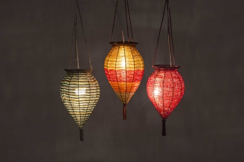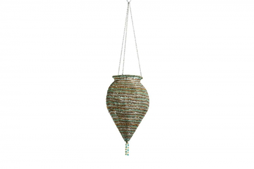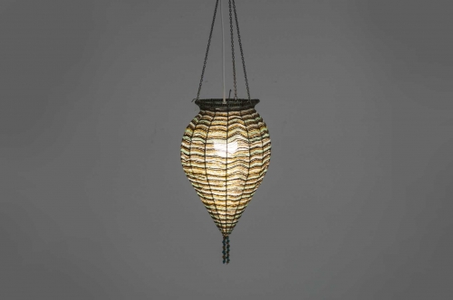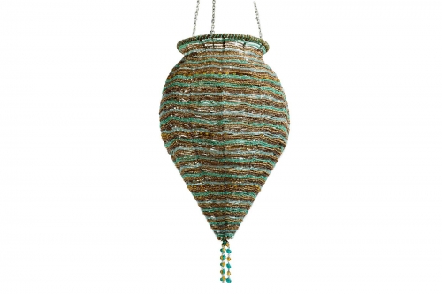 Lampadario con perline celesti e bronzo dorato. I colori caldi ed i bellissimi riflessi di luce creano una rilassante atmosfera orientale.