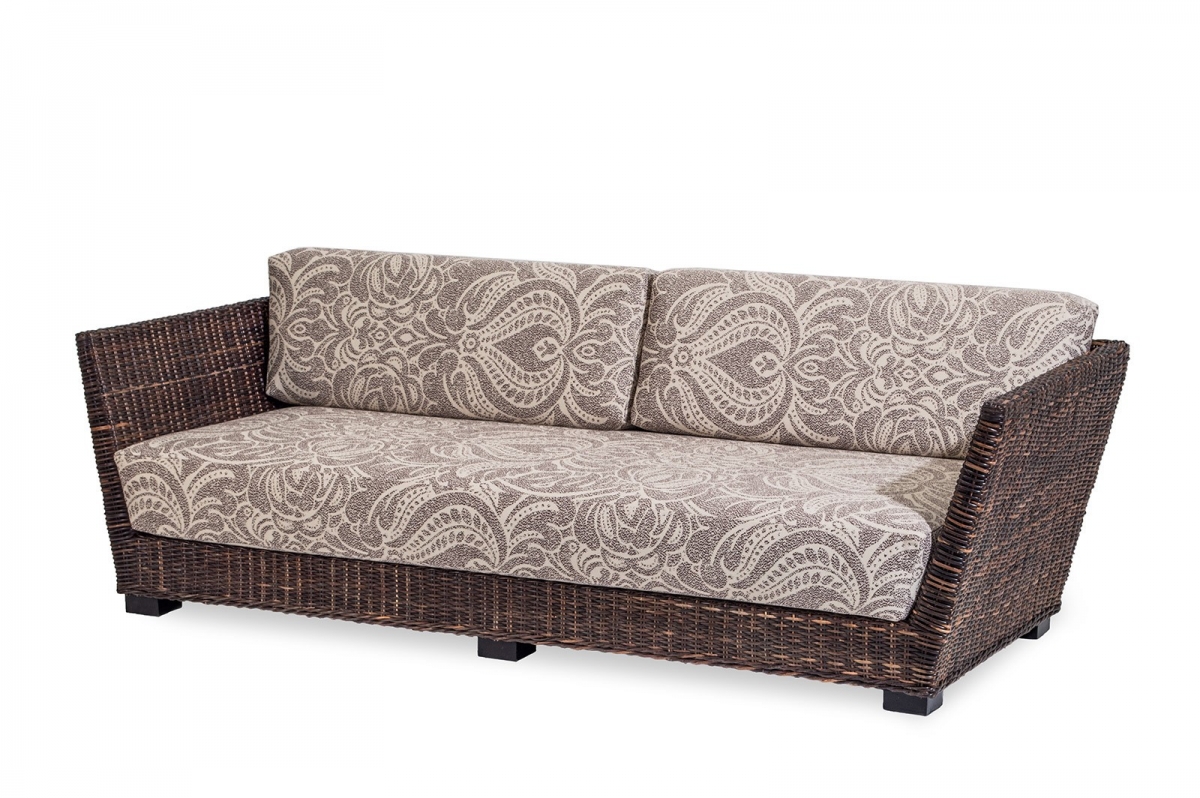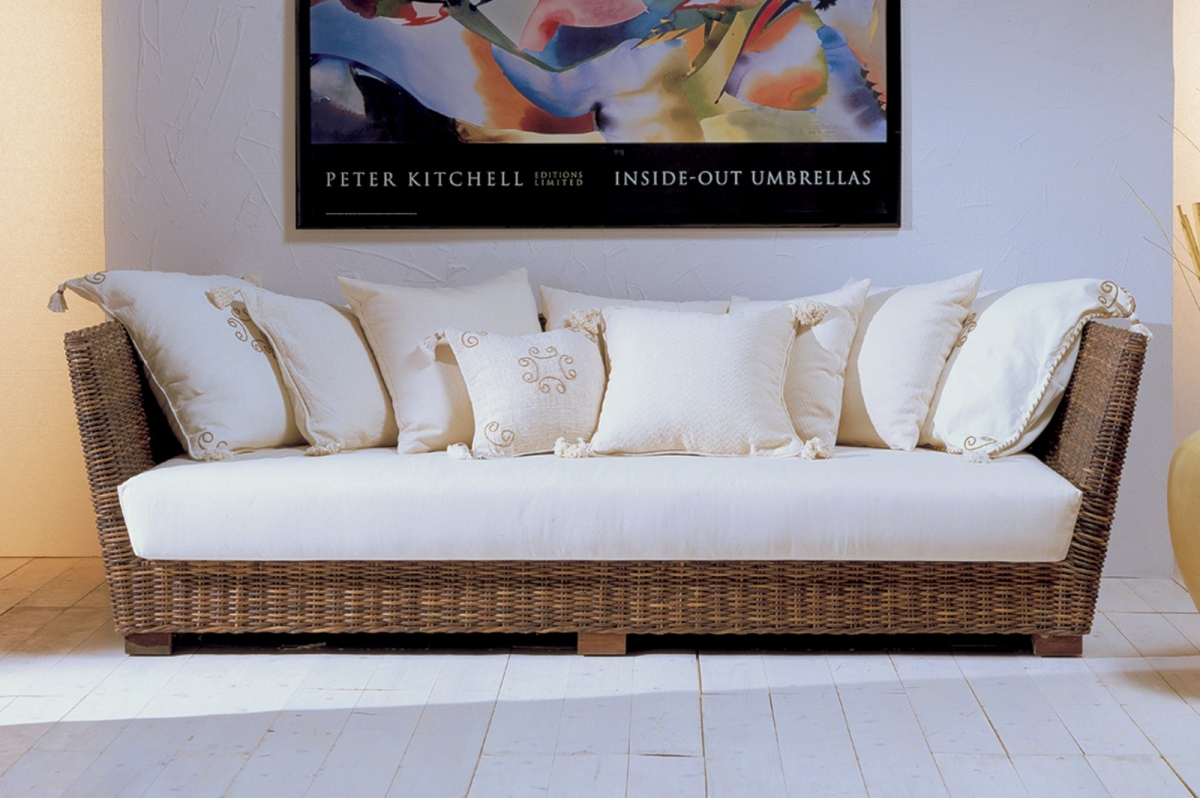 Divano in Rattan con telaio in legno, intrecciato in croco o giunco naturale da 6mm. Finitura trasparente opaca.