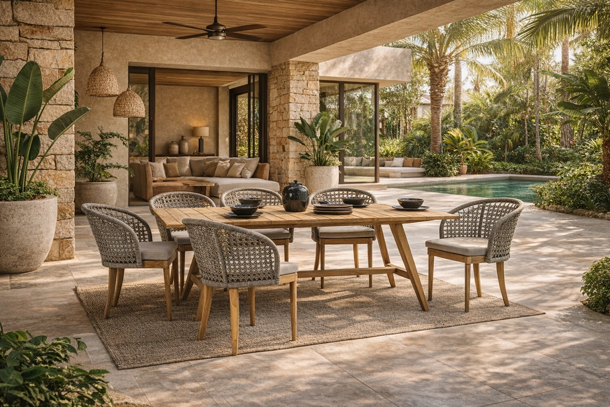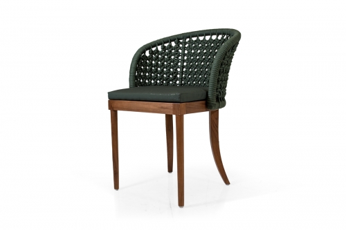 Un basamento in teak naturale ed è rivestito da cuscineria in sfoderabile e lavabile.