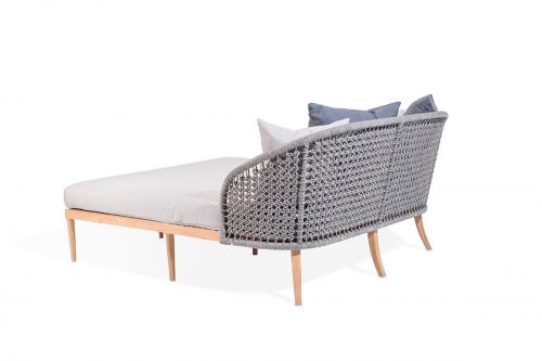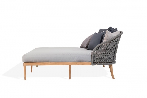 Un basamento in teak naturale ed è rivestito da cuscineria in sfoderabile e lavabile.