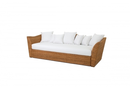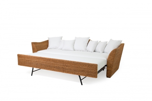 Divano letto con telaio in legno ed intreccio in rattan naturale. Finitura trasparente opaca