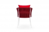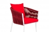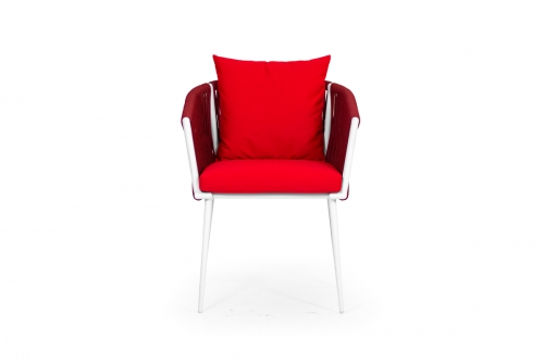 La collezione Isotta si distingue per il suo intreccio fitto e preciso, realizzato a mano da esperti Maestri Artigiani, che riveste una solida struttura in alluminio verniciato bianco, visibile nei dettagli del bracciolo e dello schienale. Il contrasto tra l’intensità dei cuscini colorati e l’eleganza dei materiali rende ogni pezzo unico e riconoscibile.