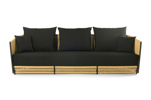 La collezione Isotta si distingue per il suo intreccio fitto e preciso, realizzato a mano da esperti Maestri Artigiani, che riveste una solida struttura in alluminio verniciato bianco, visibile nei dettagli del bracciolo e dello schienale. Il contrasto tra l’intensità dei cuscini colorati e l’eleganza dei materiali rende ogni pezzo unico e riconoscibile.
