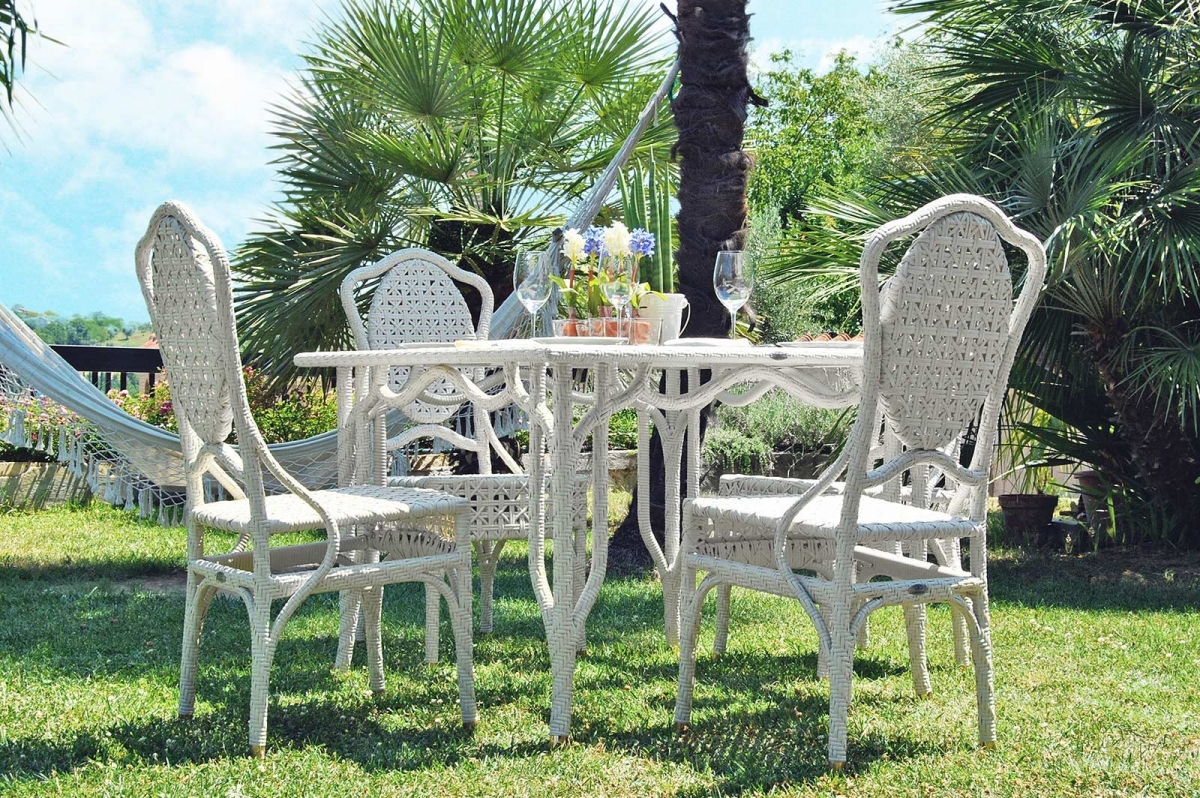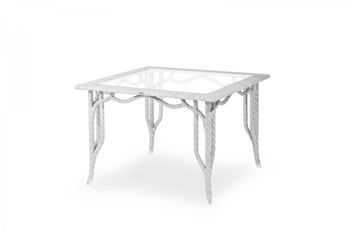 - Tavolo da pranzo interamente intrecciato a mano da maestri artigiani; top in vetro.