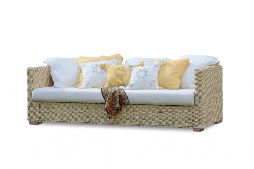 Divano 3 posti in Rattan con telaio in legno, intrecciato in giunco naturale da 6mm. Finitura trasparente opaca.
