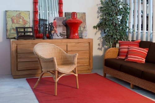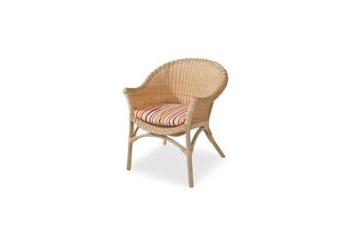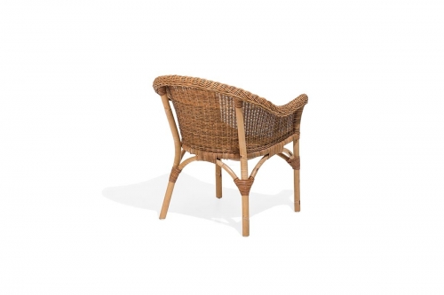 Poltroncina con telaio in manao, intrecciato in midollino o giunchino da 3 mm. Finitura trasparente opaca