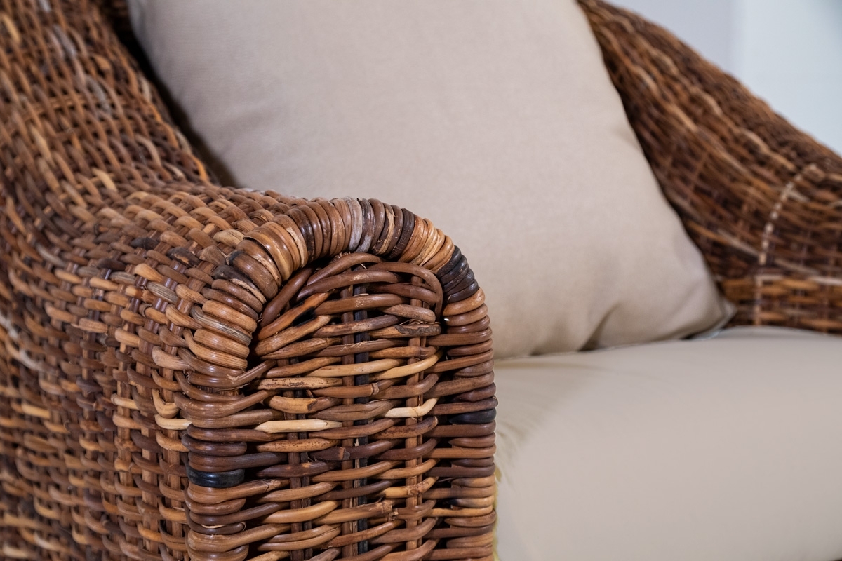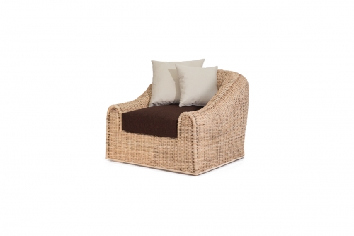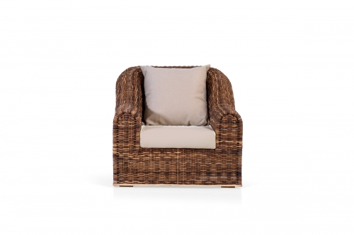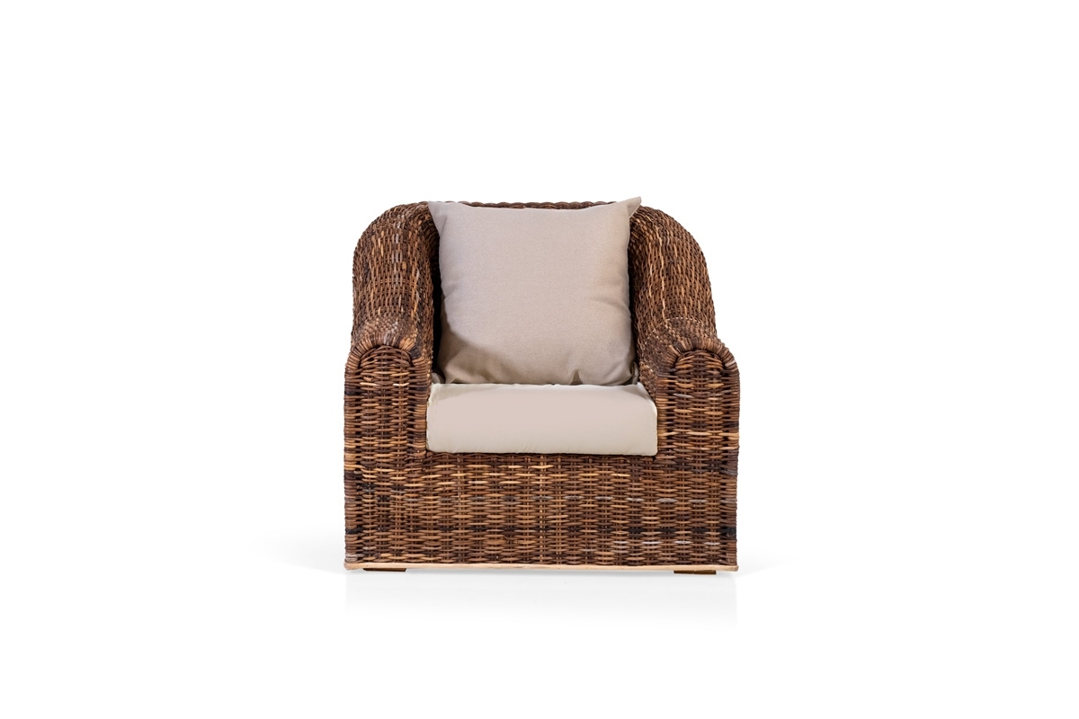 Poltrona in Rattan con telaio in legno, intrecciato in giunco naturale da 6 mm. Finitura trasparente opaca..
