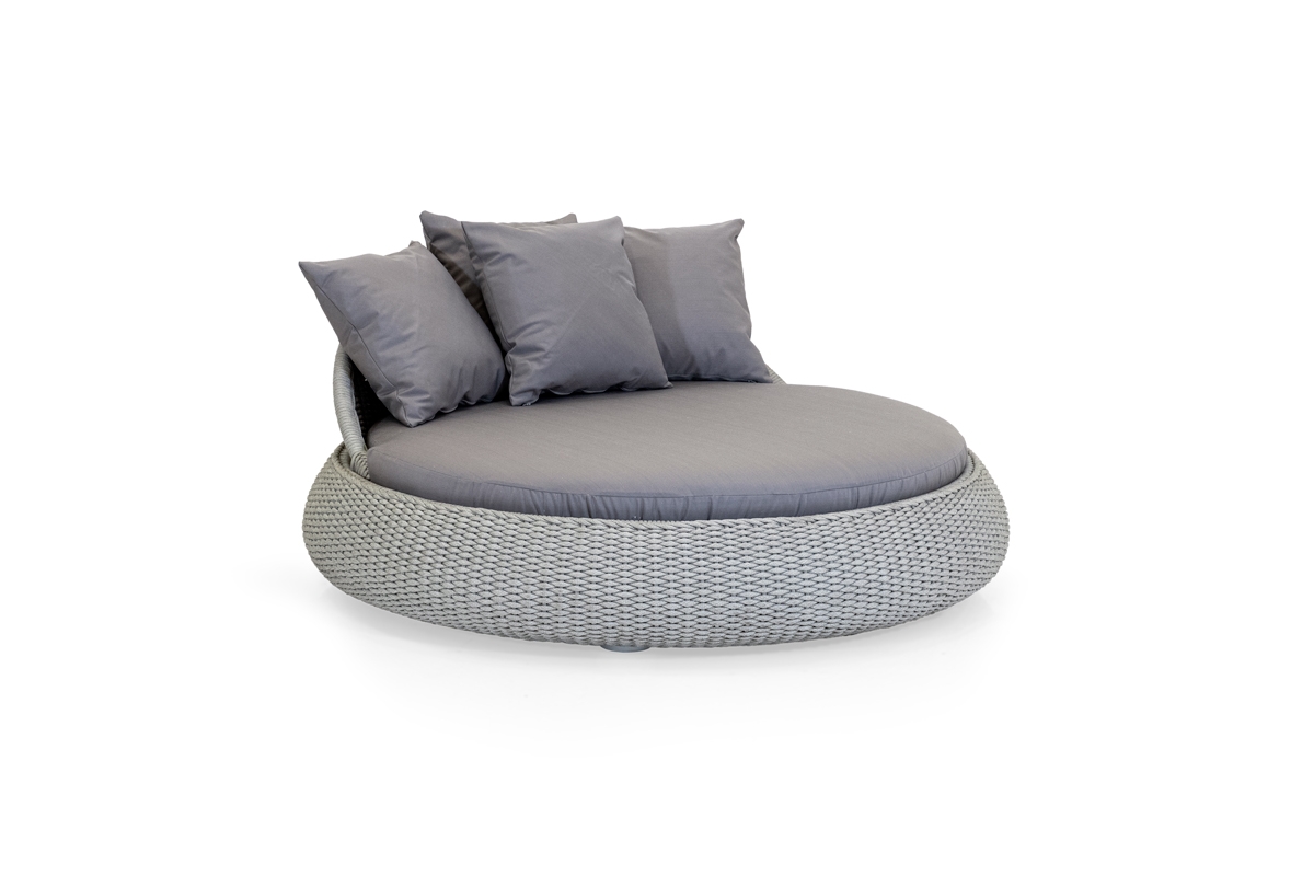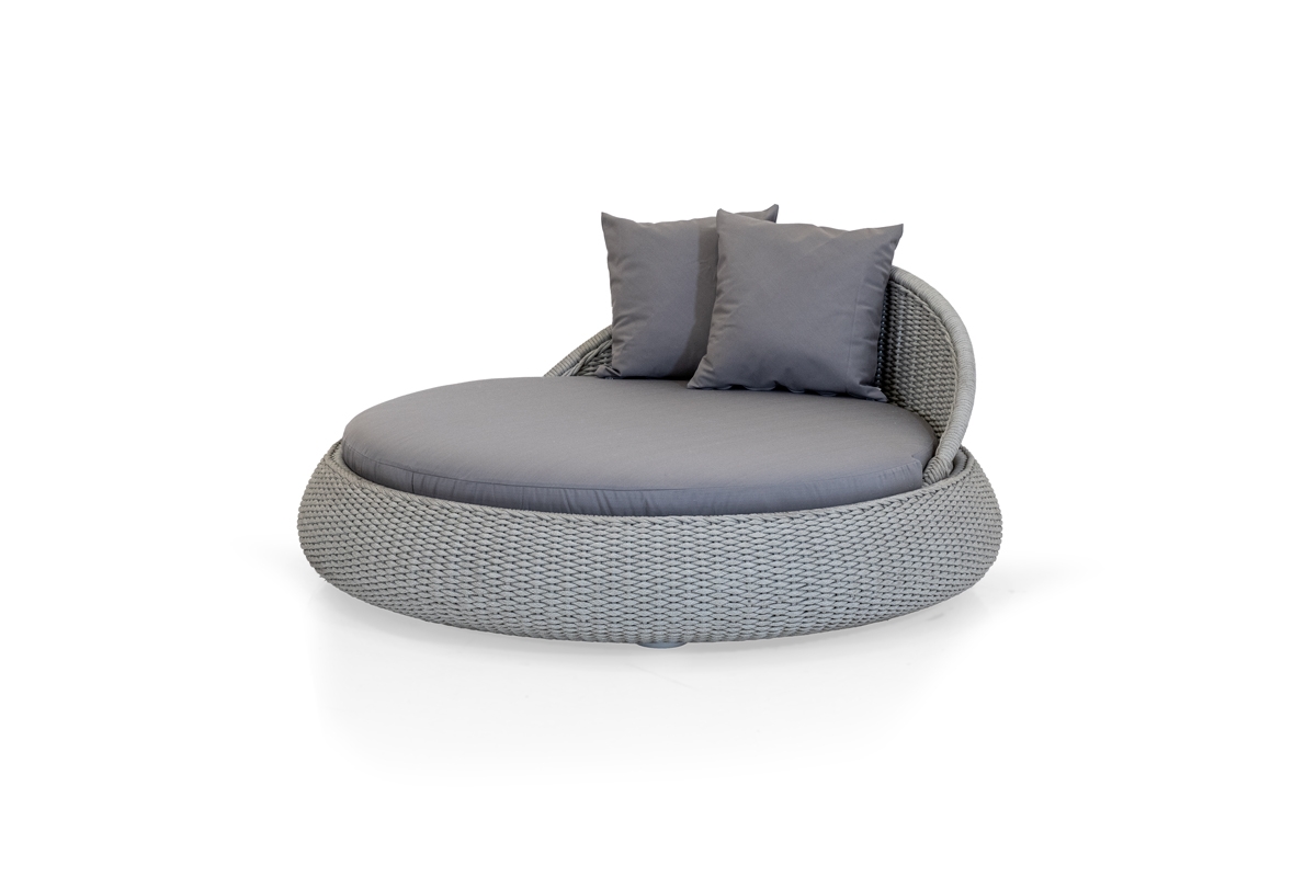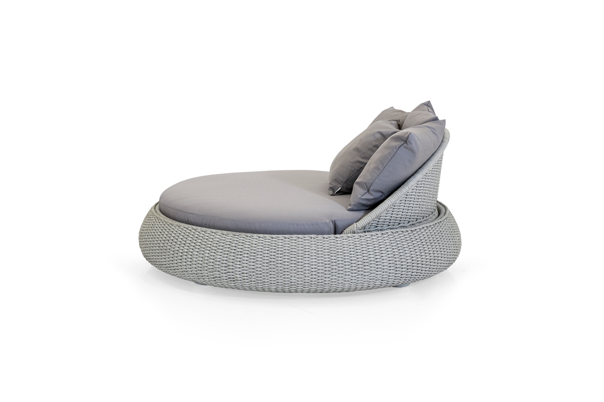 La linea PERLE ha un telaio in alluminio ricoperto da un intreccio in corda di polipropilene interamente fatto a mano.