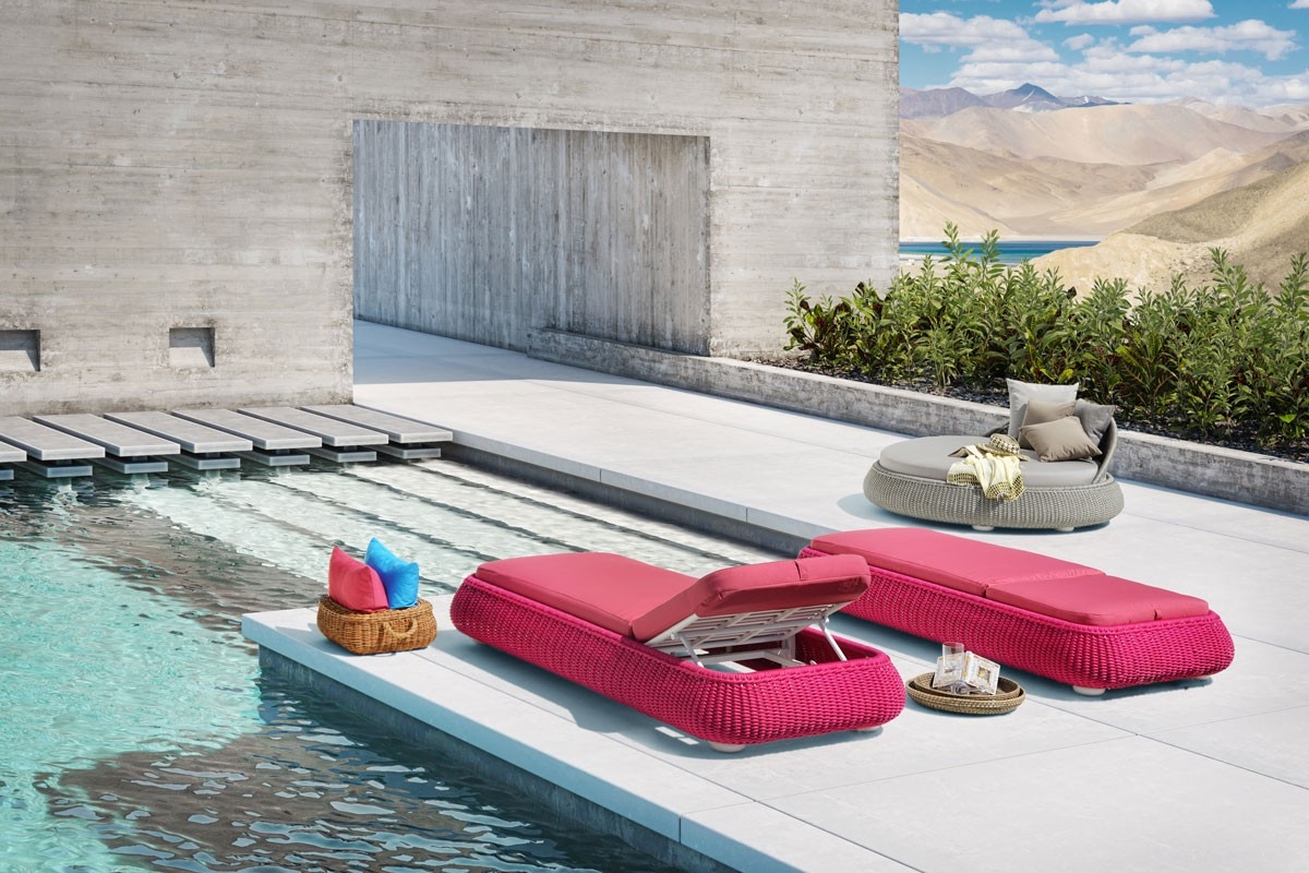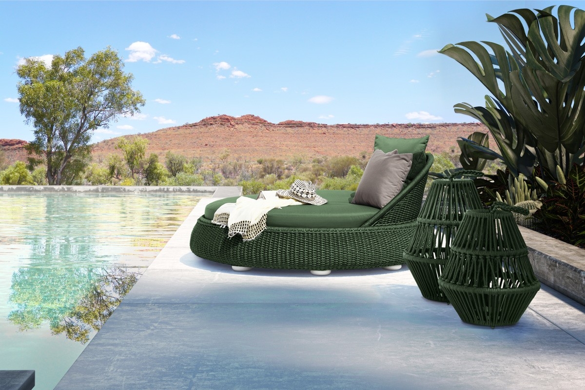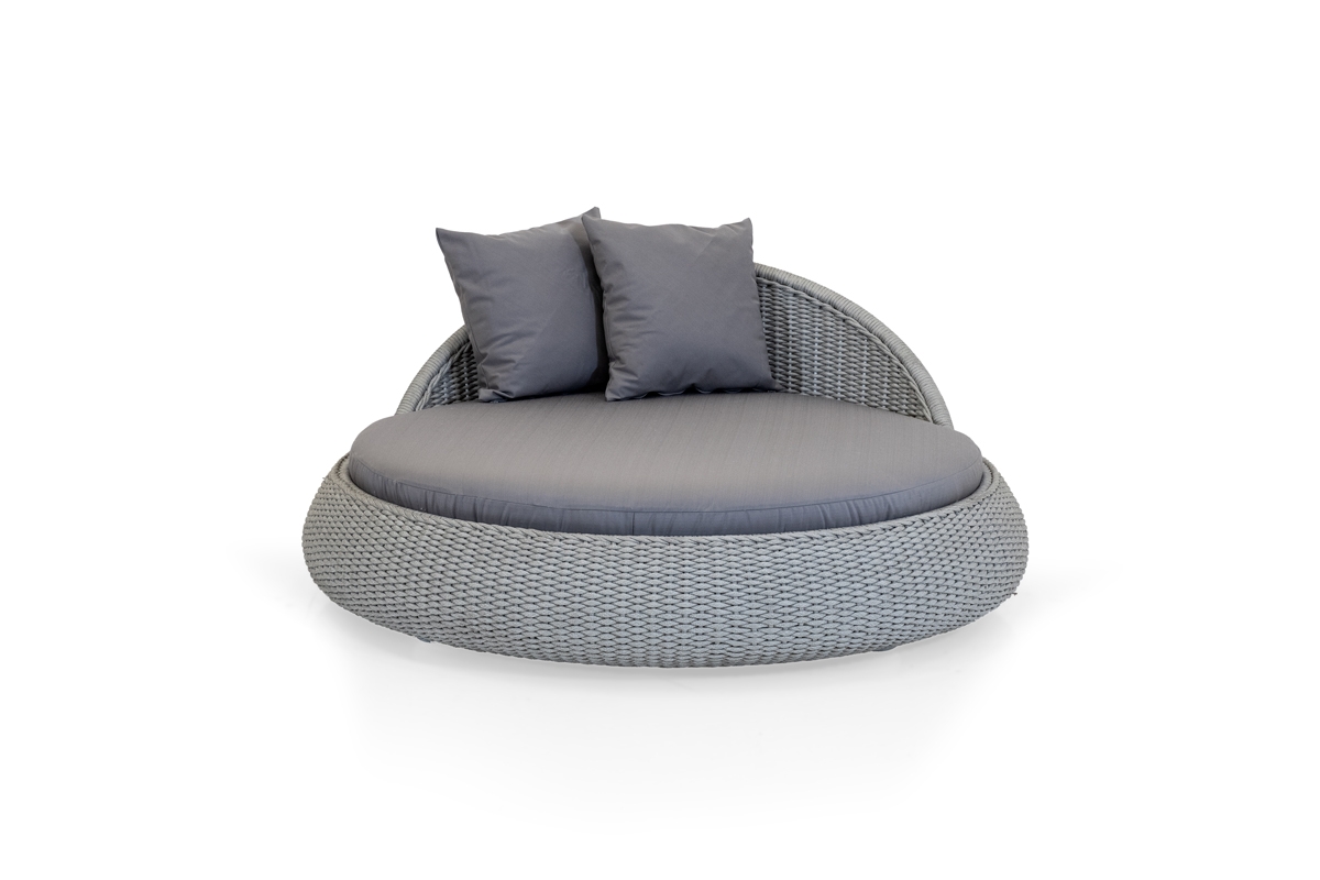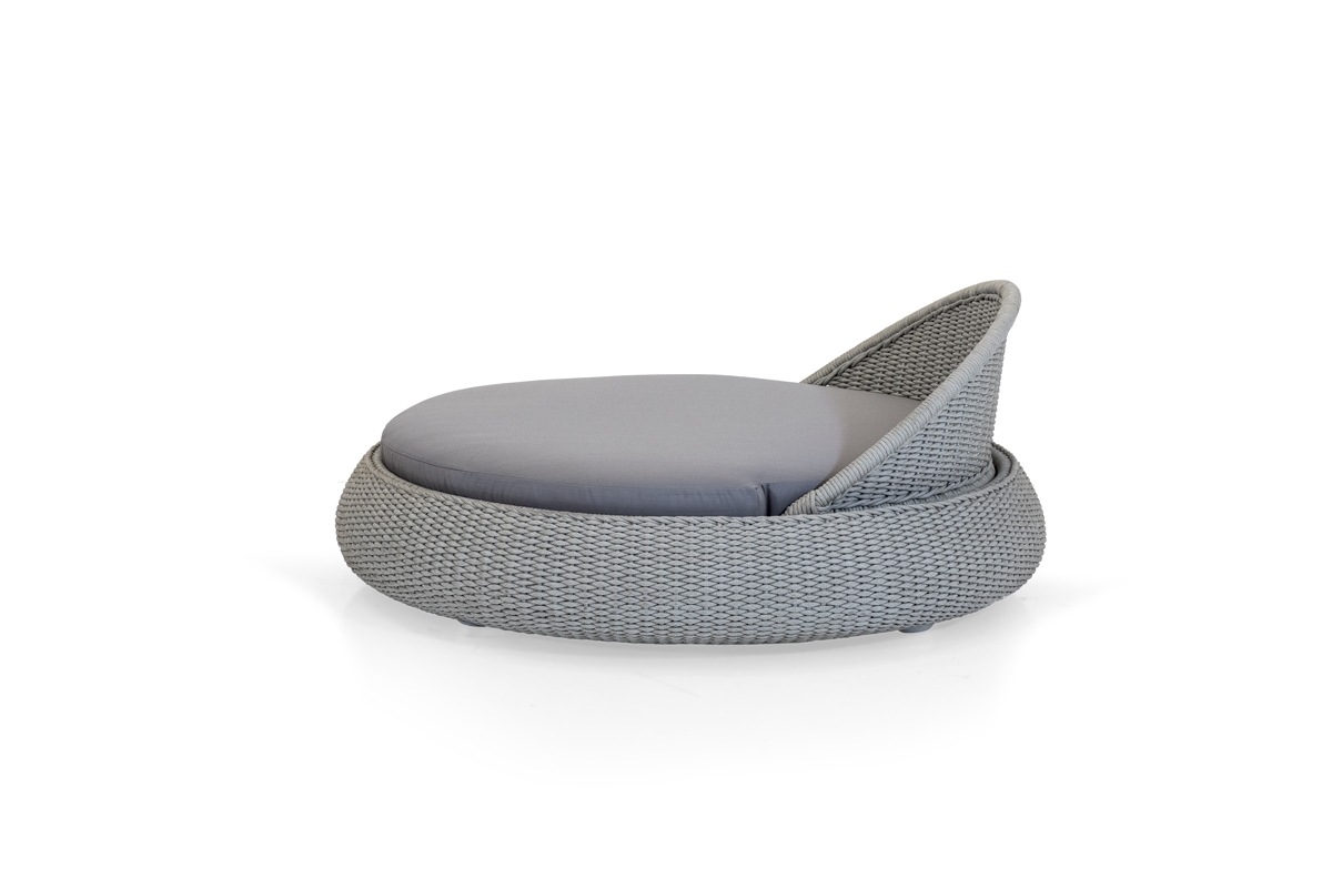 La linea PERLE ha un telaio in alluminio ricoperto da un intreccio in corda di polipropilene interamente fatto a mano.