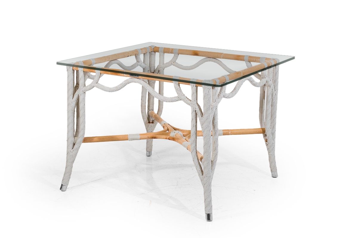 - Tavolo da pranzo interamente intrecciato a mano da maestri artigiani; top in vetro.